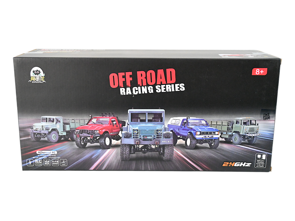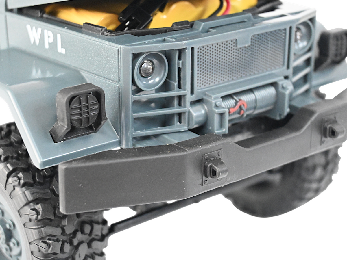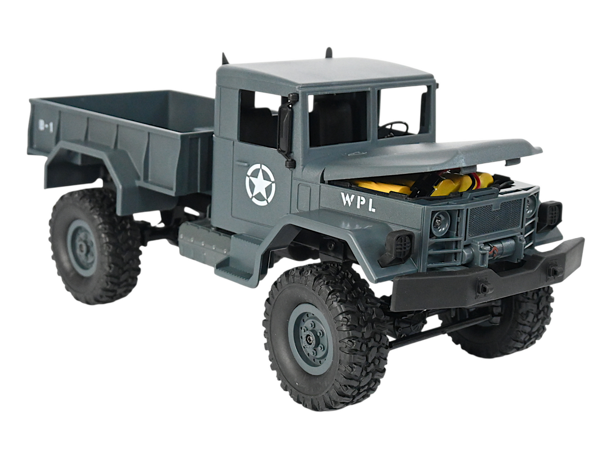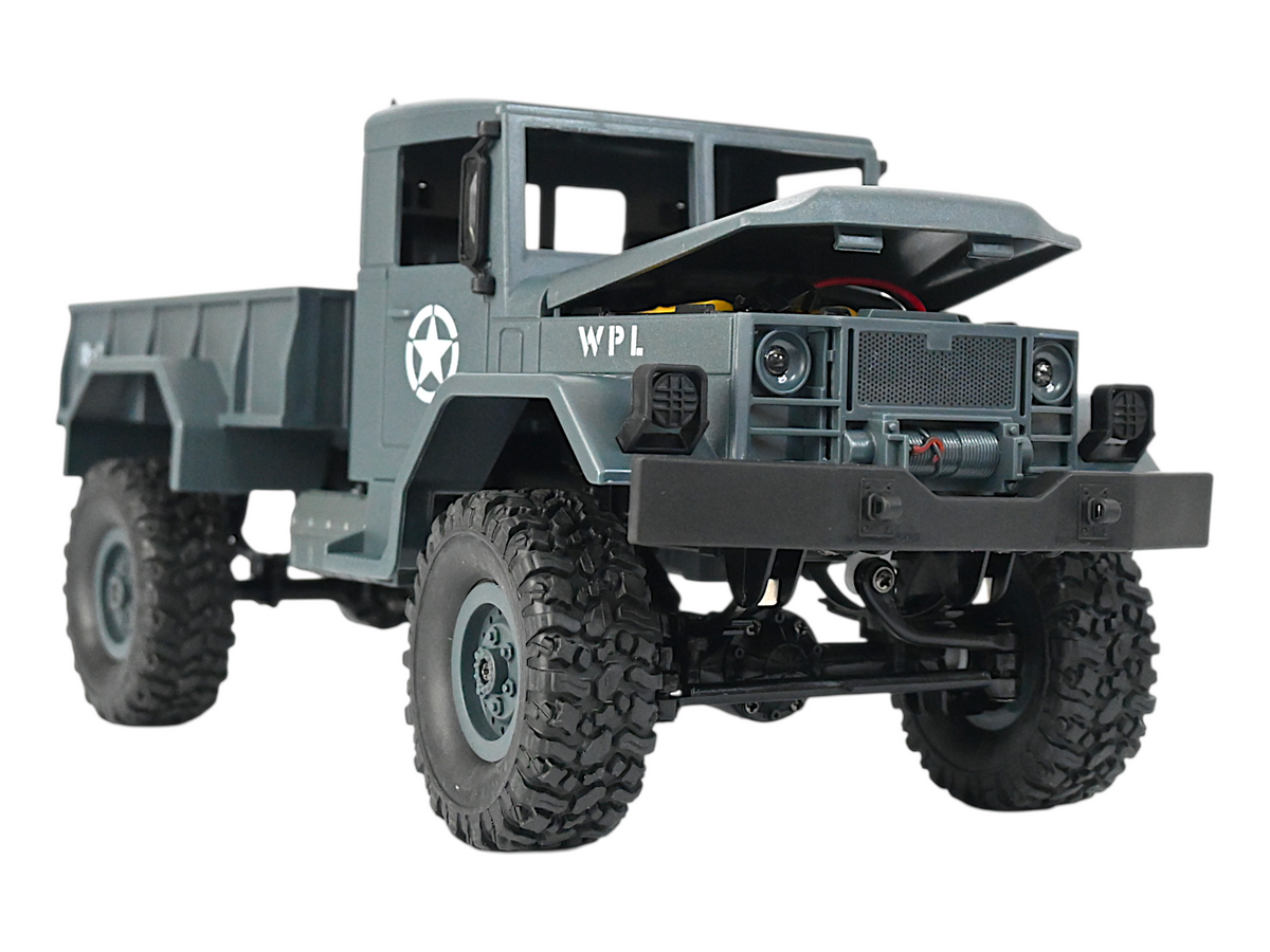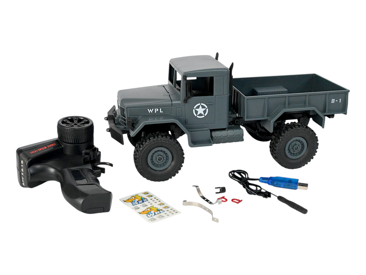 Радиоуправляемый военный грузовик, выполненный в масштабе 1/16. Модель оснащена полным приводом, действующей рессорной подвеской и мощным коллекторным электромотором. Выпускается в различных вариантах окраски, имеет богатую деталировку и светящиеся передние фары. В кабине прекрасная детализация интерьера. Кузов и кабина изготовлены из прочного АВS пластика и установлены на металлическую раму. Li-Ion аккумулятор 7.4В, 500мАч спрятан под открывающийся капот.