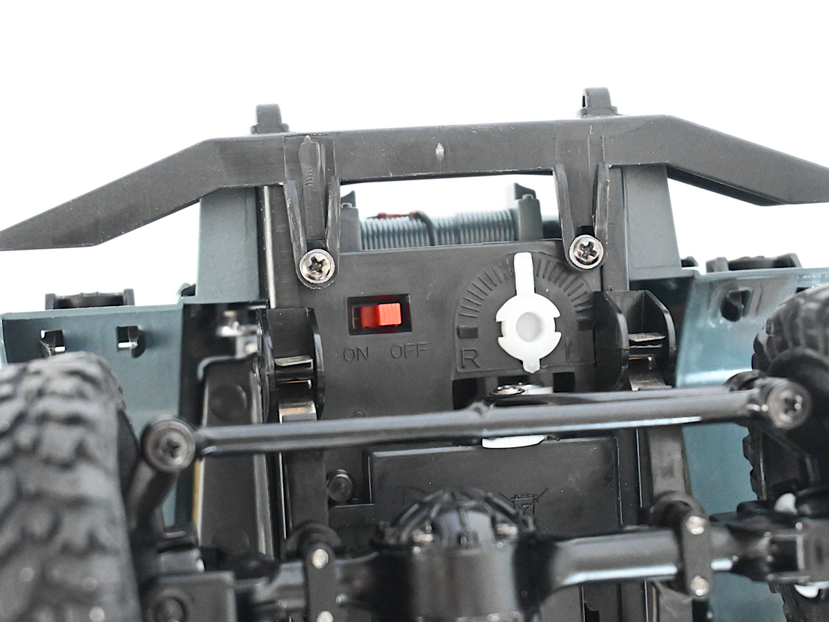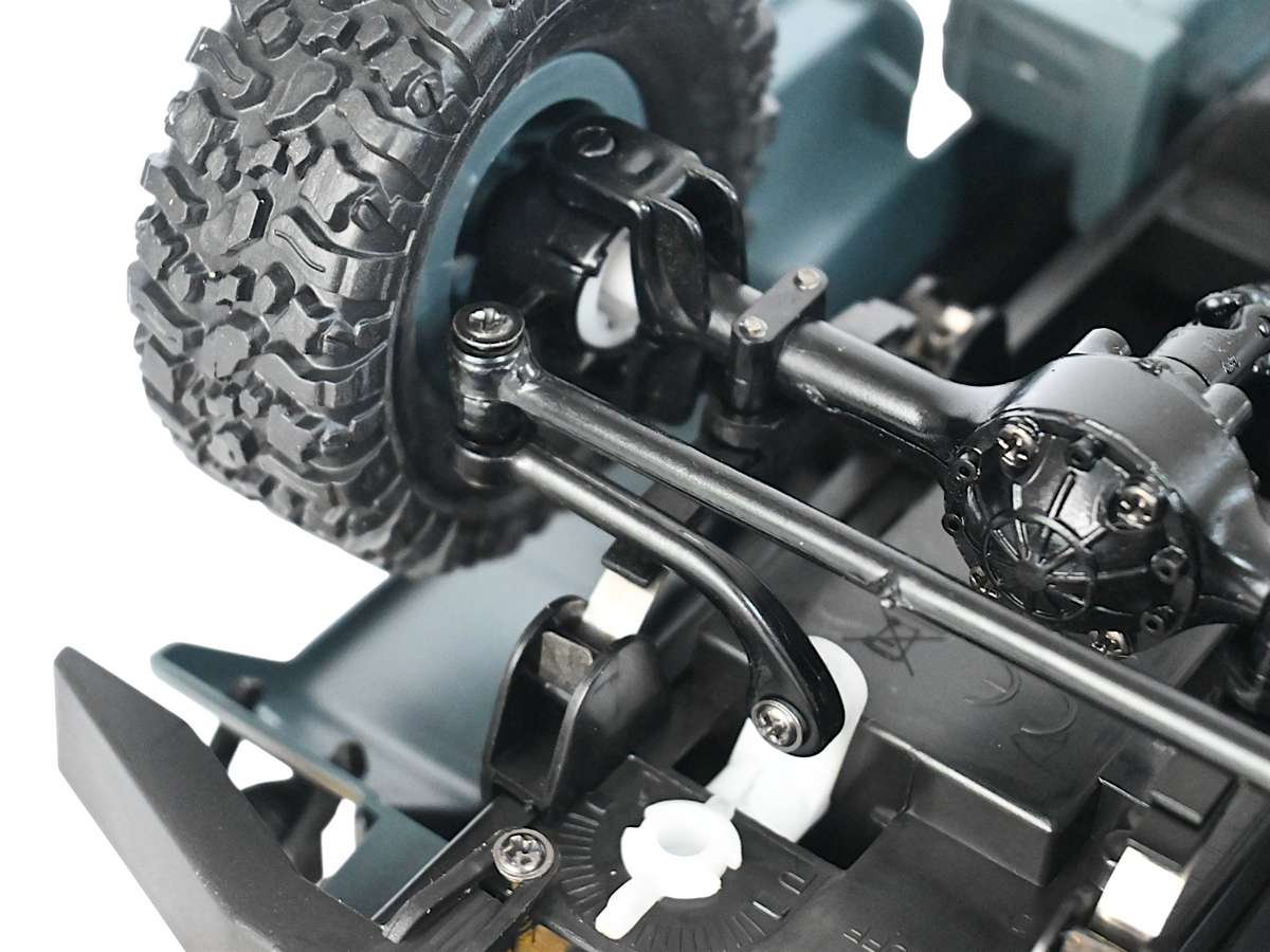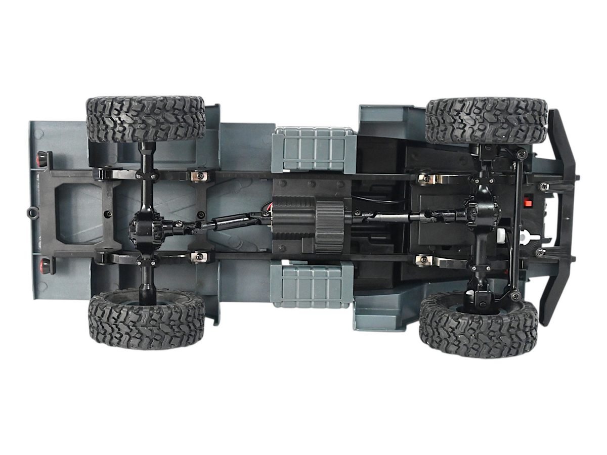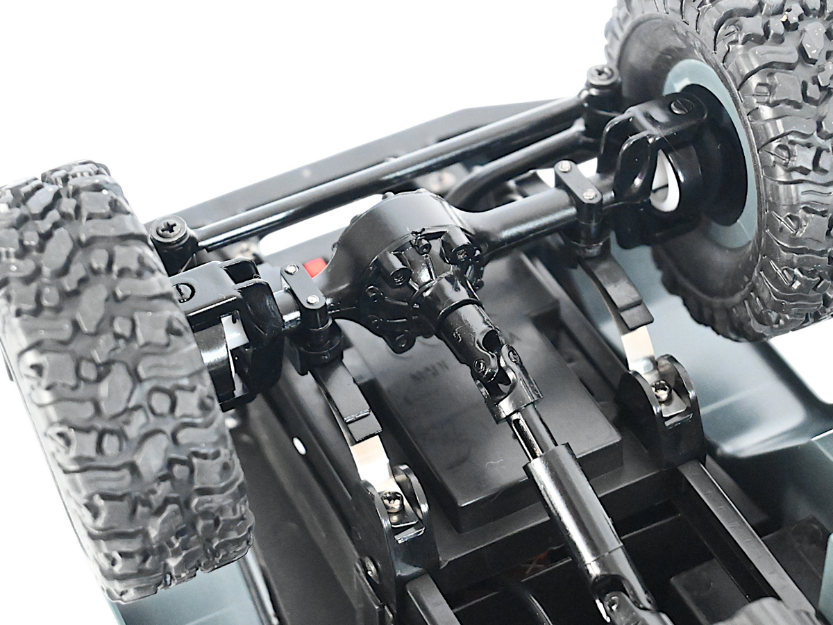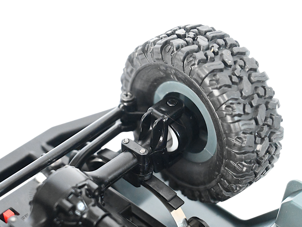Радиоуправляемый грузовик имеет полный карданный привод и дифференциалы. Мосты установлены на металлических рессорах, что позволяет комфортно перевозить различные предметы по неровной дороге. Колеса с мягкими резиновыми шинами с агрессивным протектором позволяют миниатюрному грузовику без проблем преодолевать бездорожье.