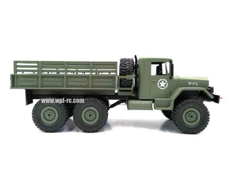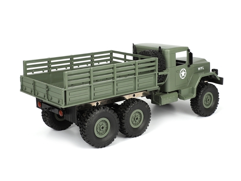 Радиоуправляемая модель военного грузовика масштаба 1:16 с постоянным полным приводом 6x6, коллекторным электромотором, пультом управления 2.4GHz, аккумулятором и USB зарядным устройством.