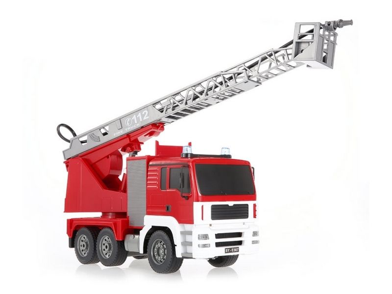 Корпус модели сделан из прочного пластика яркого красного цвета. Пожарная лестница, помпа, кабина – все детали максимально точно копируют устройство настоящей пожарной машины. Моделью легко управлять,она не имеет опасных мелких деталей, с управлением справиться даже ребенок в возрасте от 6 лет.