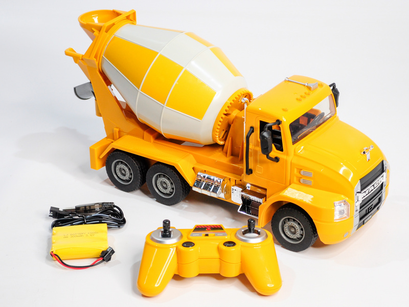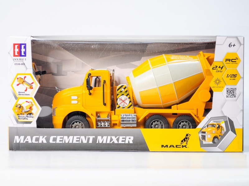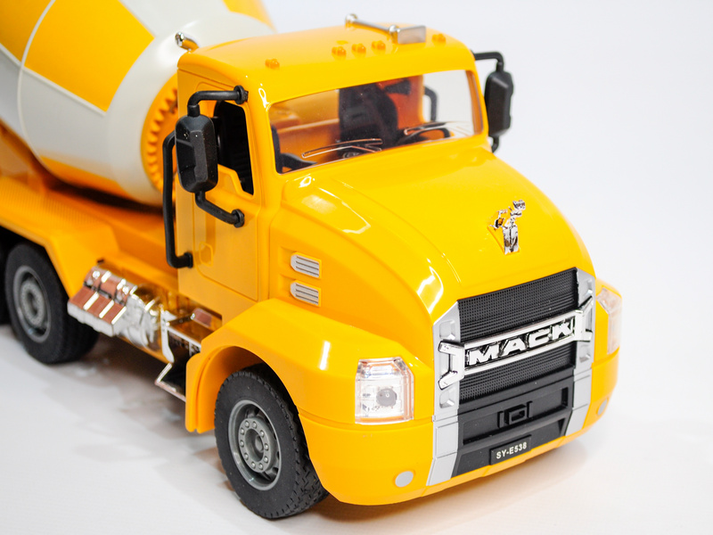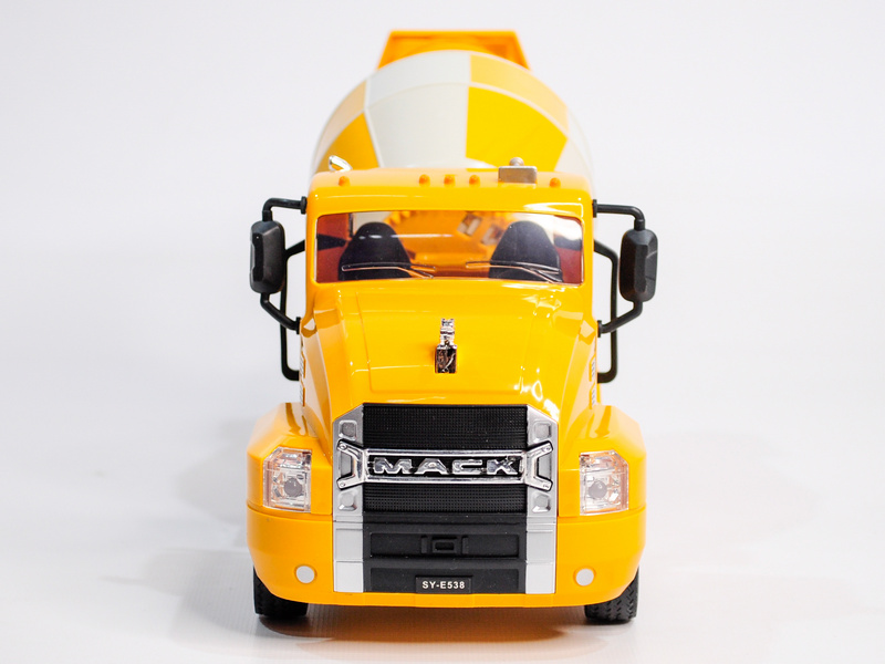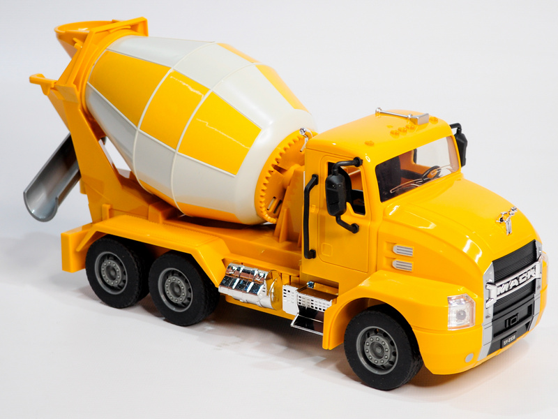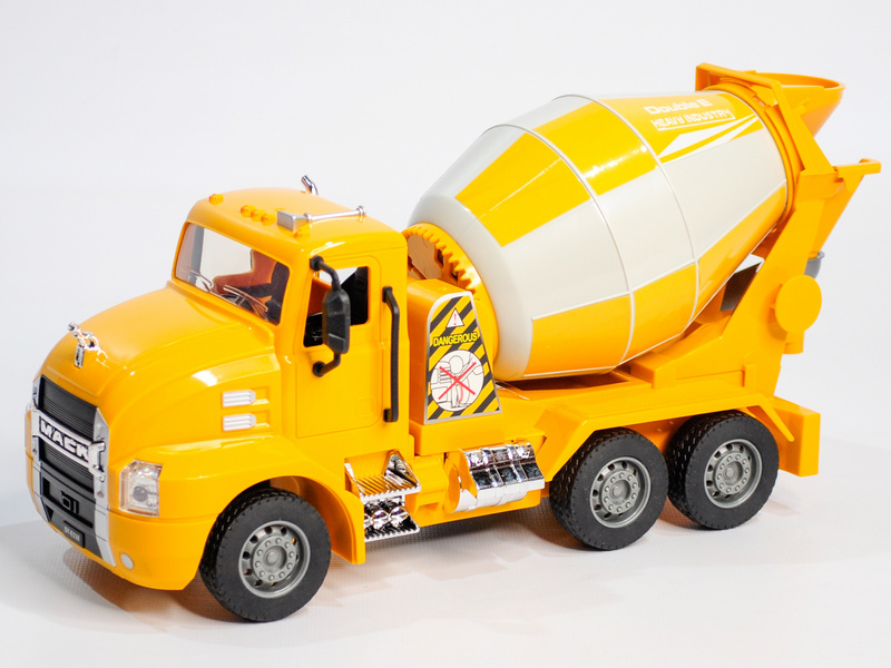 Бетоновоз (бетономешалка) Double Eagle MACK в миниатюрном размере. Корпус модели полностью повторяет оригинальную машину: яркий жёлтый кузов и большие колёса. Кузов выполняет свою реальную функцию — он вращается. А ещё машинка издаёт реалистичные звуки работающего двигателя.