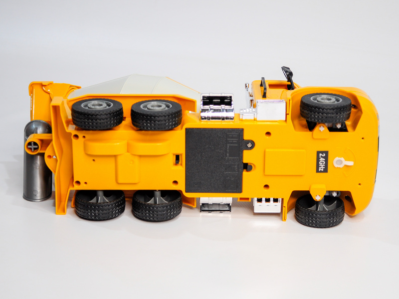 Пульт выполнен в форме джойстика с аналоговыми стиками. Пульт большой и также имеет строительный цвет - желтый. С пульта управляется не только бетоновоз, но кузов. Машинка быстро набирает максимальную скорость и весьма уверенно ведёт себя не только на полу дома, но и на настоящей стройке во дворе.