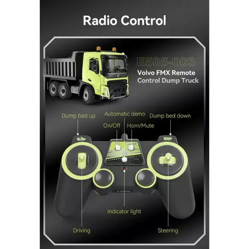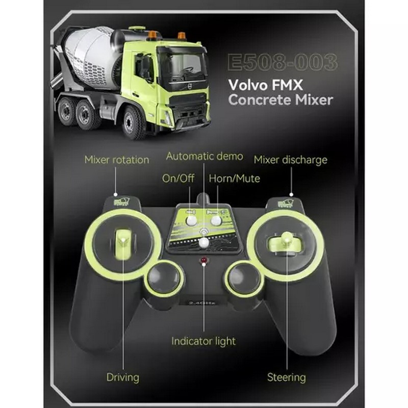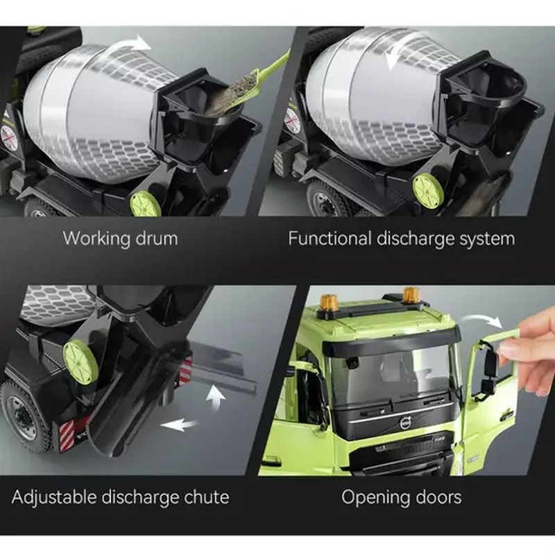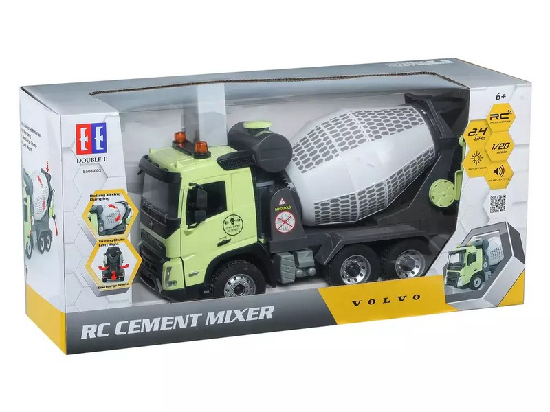 Радиоуправляемый бетоновоз Volvo FMX от Double Eagle в масштабе 1:20. Высокая степень детализации. Оснащён механизмом вращения. Смеситель вращается и выгружается дистанционно с помощью пульта дистанционного управления. Бетоновоз обладает светодиодной подсветкой и рабочими звуками. Эта инженерно-строительная игрушка не только помогает детям получить больше знаний о транспортных средствах, но и позволяет им потенциально заинтересоваться профессиями, связанными с ними.