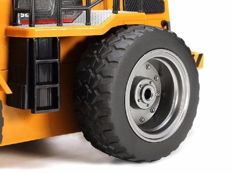 Игрушка полностью функциональная, а все ее действия управляются с пульта. При движении бульдозер издает звуковые эффекты мотора и работы приводов. При движении назад включается сигнал заднего хода.