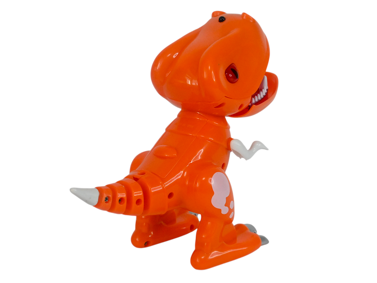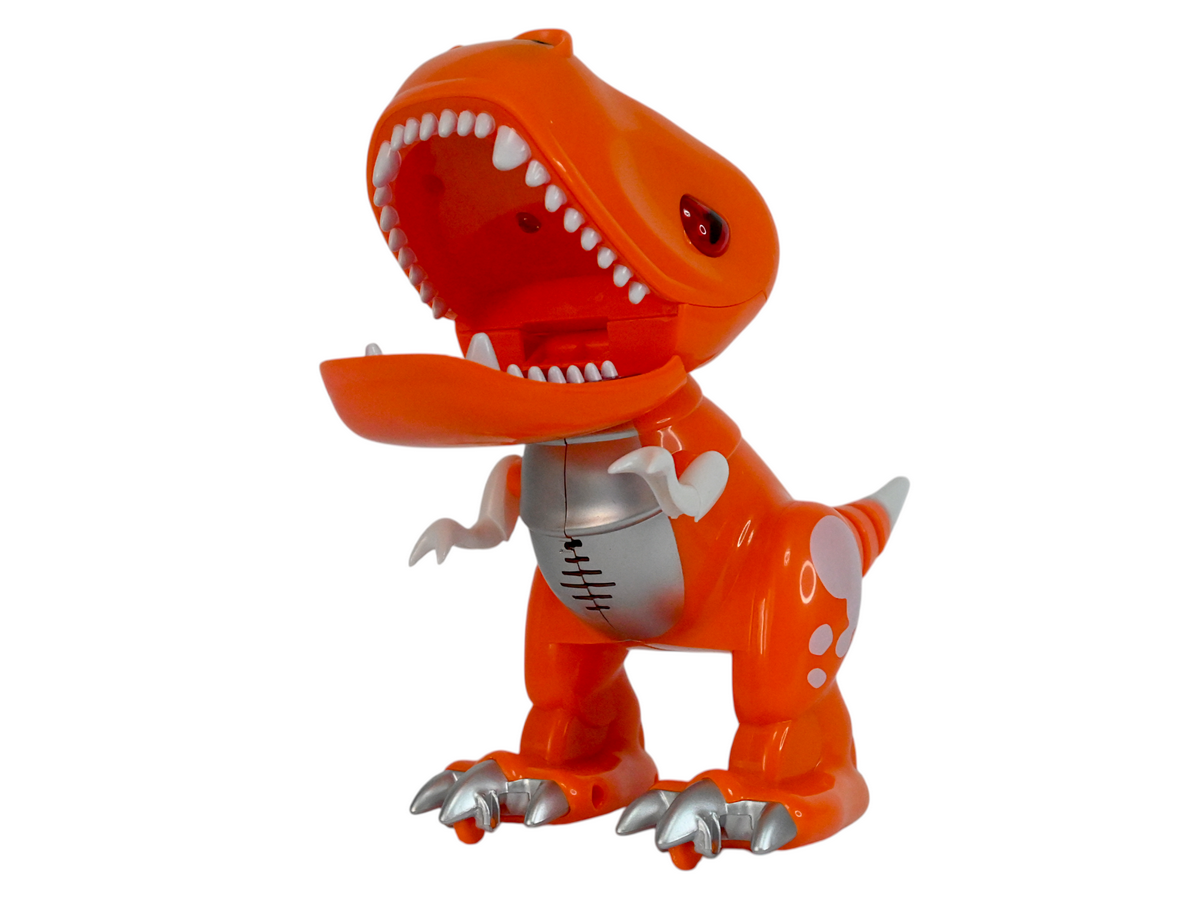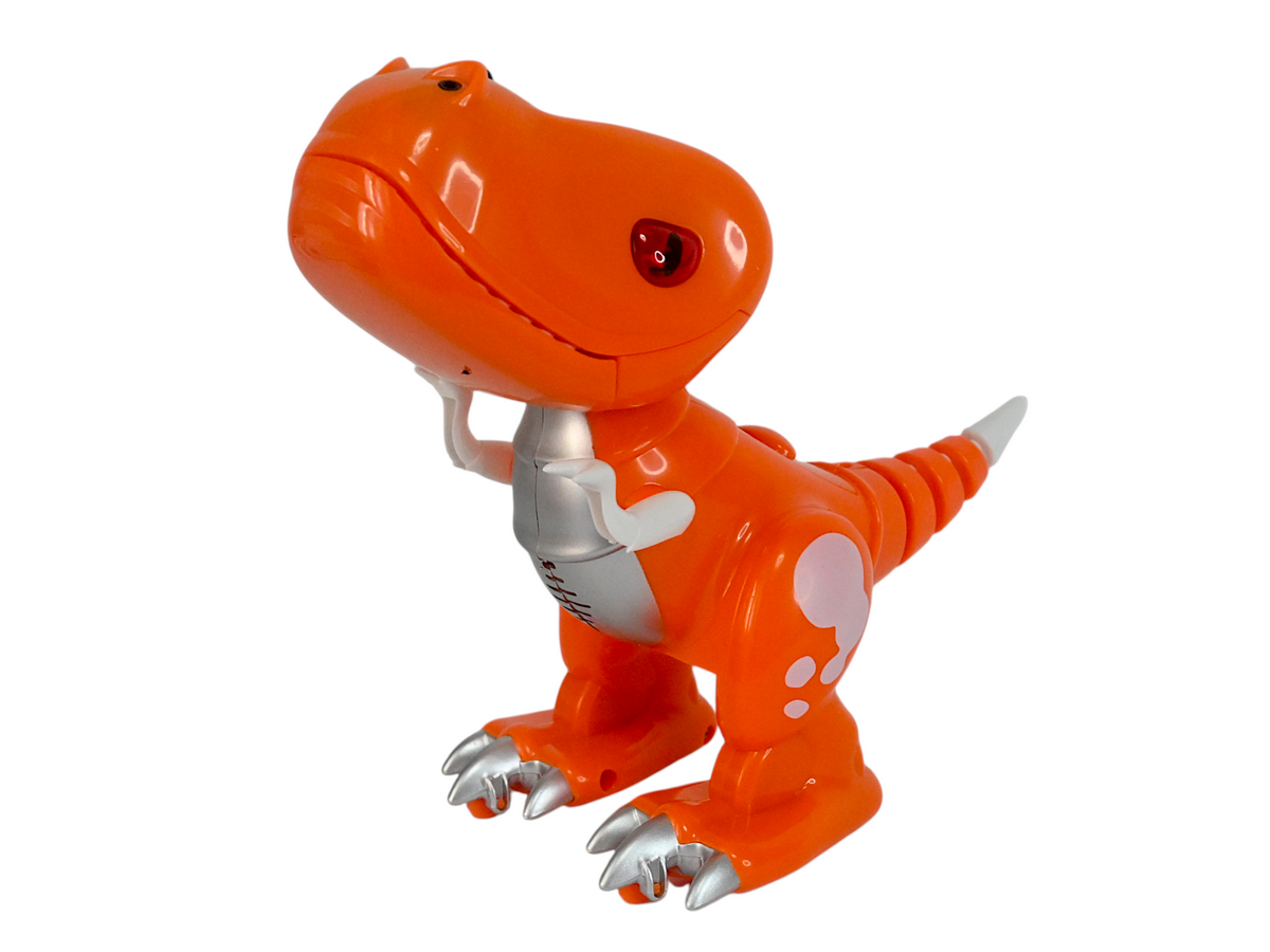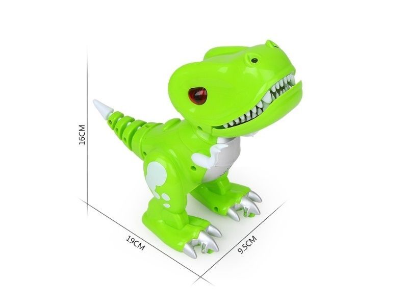 У динозаврика подвижные челюсти и конечности, глаза и рот оснащены светодиодными огнями. И он умеет издавать звуки, чтобы игра с ним стала интереснее.