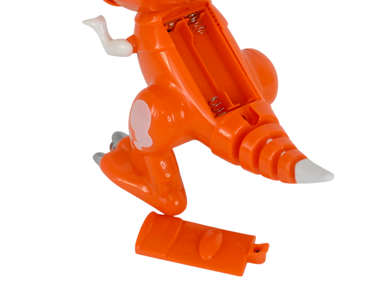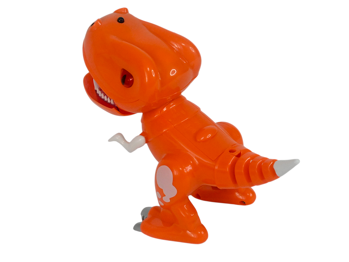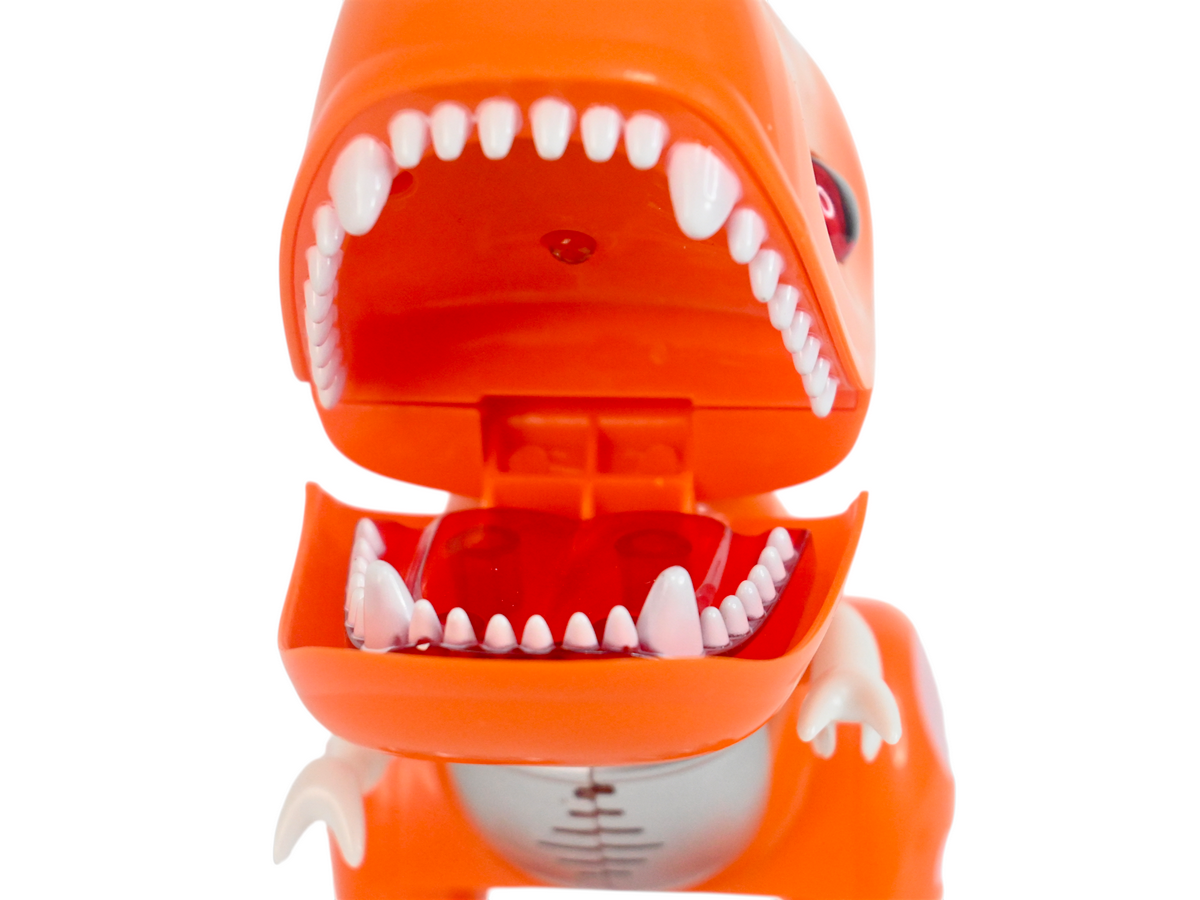 У динозаврика подвижные челюсти и конечности, глаза и рот оснащены светодиодными огнями. И он умеет издавать звуки, чтобы игра с ним стала интереснее.