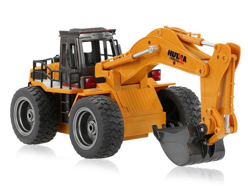 Модель экскаватора на больших резиновых колесах. Выполнен очень реалистично и полностью функционирует. Управляется по принципу гусеничного экскаватора, а это означает что строительная машина очень маневренна и может делать разворот на 360 градусов на одном месте. Игрушка сделана из качественного и безопасного пластика.