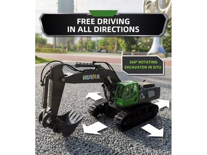 Радиоуправляемый экскаватор в масштабе 1:18 просто поражает воображение своим качеством исполнения и высокой степенью детализации. На фото его будет очень трудно отличить от настоящего. Мощный манипулятор с ковшом может копать различные типы грунта, а прочные резиновые гусеницы приспособлены к езде по любой местности. Экскаватор может разворачиваться на одном месте на 360 градусов в ограниченном пространстве. Кабина экскаватора поворачивается во все стороны как у настоящего, независимо от гусеничного шасси.
