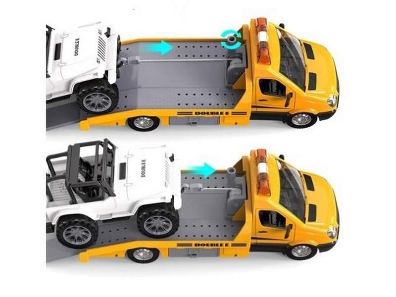 Эвакуатор на радиоуправлении производства известного на рынке игрушек производителя Double Eagle. Большая платформа позволяет с легкостью эвакуировать неисправную машинку. Как любая машинка эвакуатор может двигаться вперед/назад, вправо/влево. При движении загораются фары и спецсигналы.