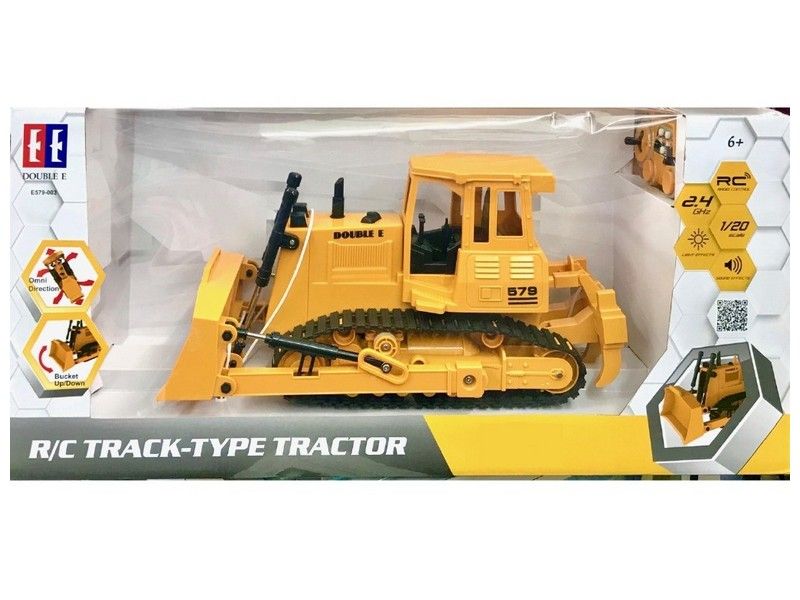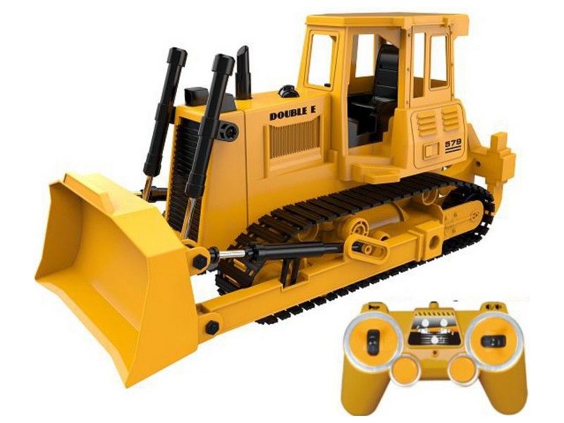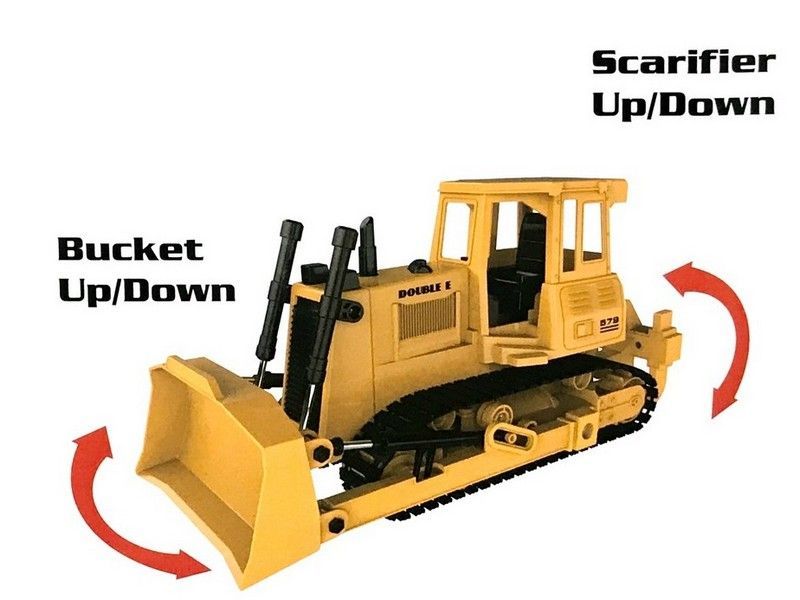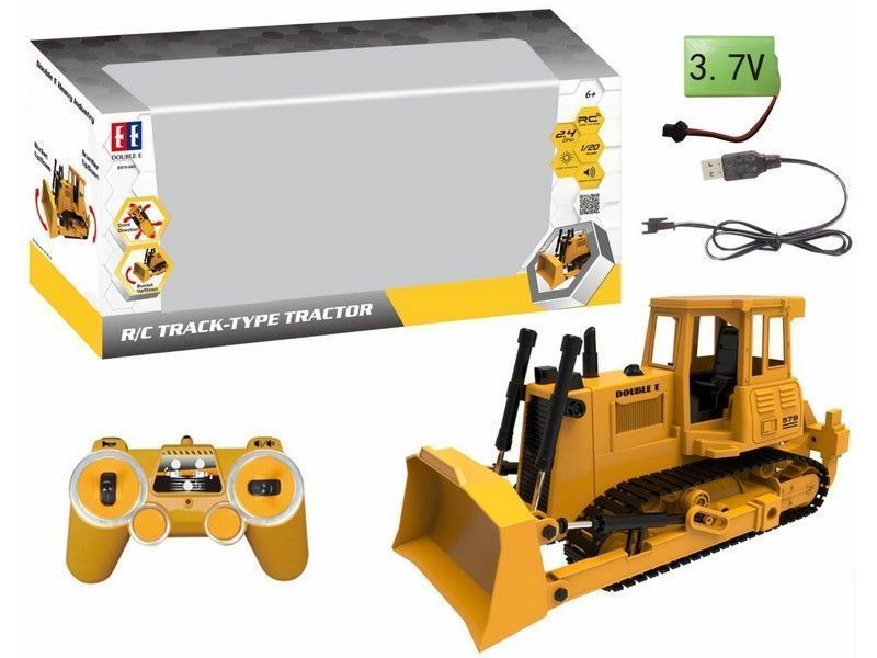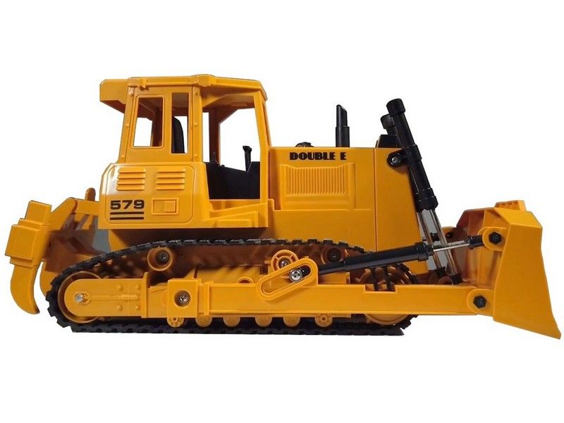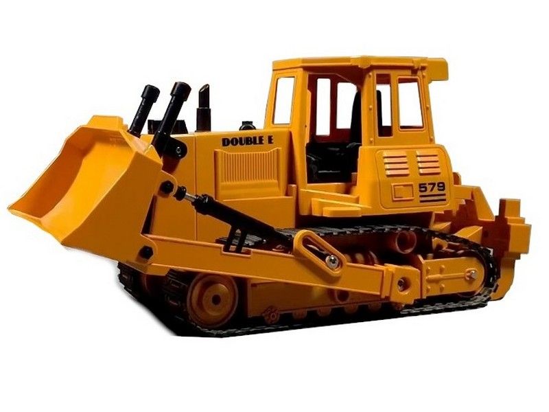 Бульдозер имеет строительный желтый стиль. Он полностью выполнен из прочного пластика, четыре электромотора обеспечивают движение вперед и назад, повороты влево и вправо, а так же для движения ковшом и вилами разрыхлителя.