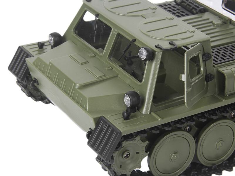 Двери кабины крепятся на резиновых петлях и открываются с двух сторон. Верхний пластиковый тент с окнами снимается и дает возможность перевозки людей и грузов. Вездеход имеет высокую степень детализации. Навесное оборудование преображает модель и делает ее максимально реалистичной.