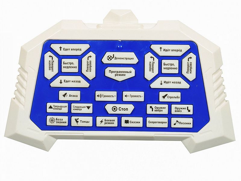 Полностью на русском языке. Управление интерактивным роботом осуществляется через эргономичный пульт с кнопками, на которых нанесены надписи функций.
