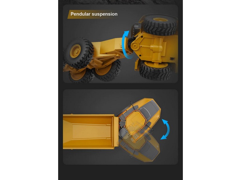 Высокопроизводительный мотор, металлические детали трансмиссии. Прочная маятниковая подвеска делает модель идеальной для любых типов поверхностей. Сигнальные огни и звуковые эффекты дополняют реалистичность самосвала. Кузов поднимается на 45 градусов.
