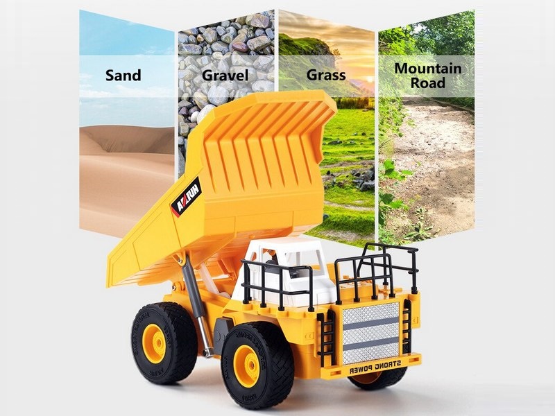 Управлять самосвалом можно при помощи пульта на частоте 2,4 ГГц, который работает от пальчиковых батареек. Так же с пульта управляется поднятие кузова грузовика. Вы сможете загрузить кузов вручную или при помощи экскаватора, перевести на нужное место и выгрузить автоматически.