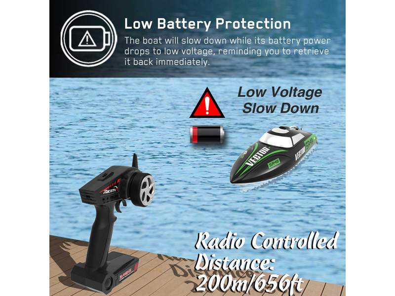 Защита от низкого напряжения будет замедлять катер при низком заряде батареи, чтобы вы смогли немедленно вернуть его обратно. Функция безопасности защитит аккумулятор от перезарядки и чрезмерной разрядки аккумулятора. Конструкция системы водяного охлаждения снижает температуру двигателя и предотвращает его перегрев.