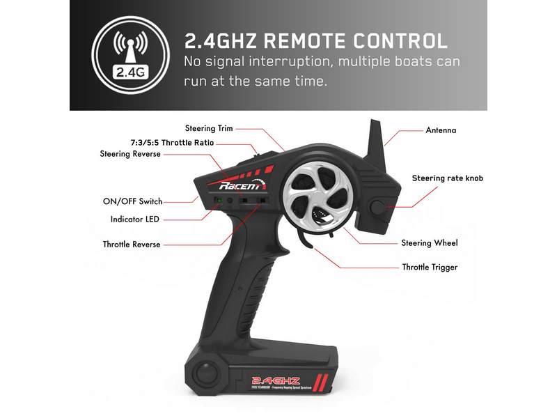 Функция восстановления при опрокидывании позволяет автоматически быстро перевернуть катер с пульта дистанционного управления и вернуться к гонке). Функция реверса позволяет катеру двигаться вперед и назад, поворачивать влево и вправо, а пульт дистанционного управления может заставить лодку делать очень крутые повороты.
