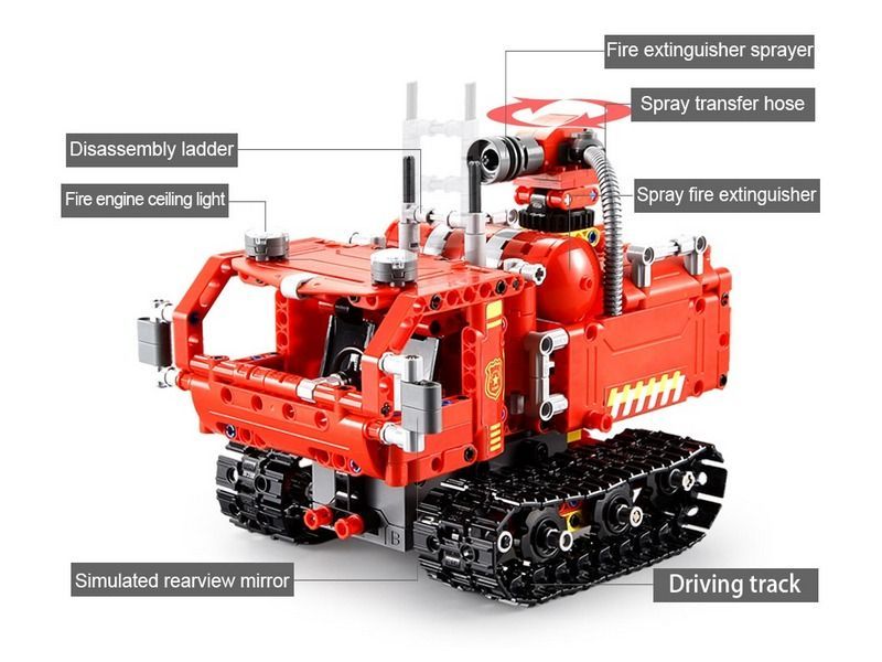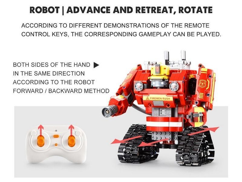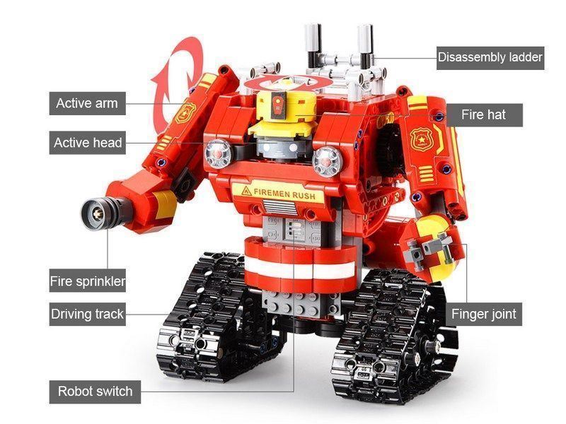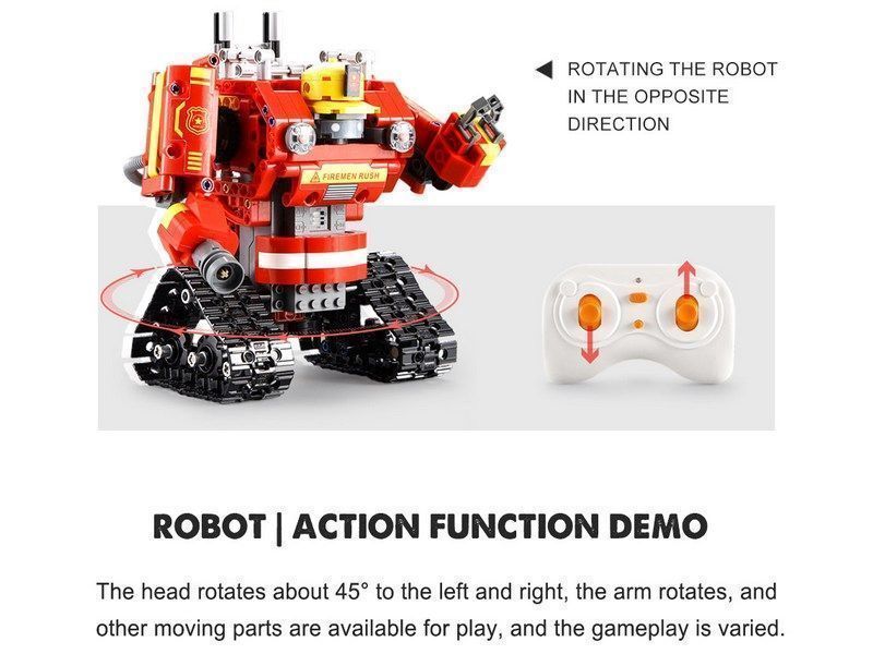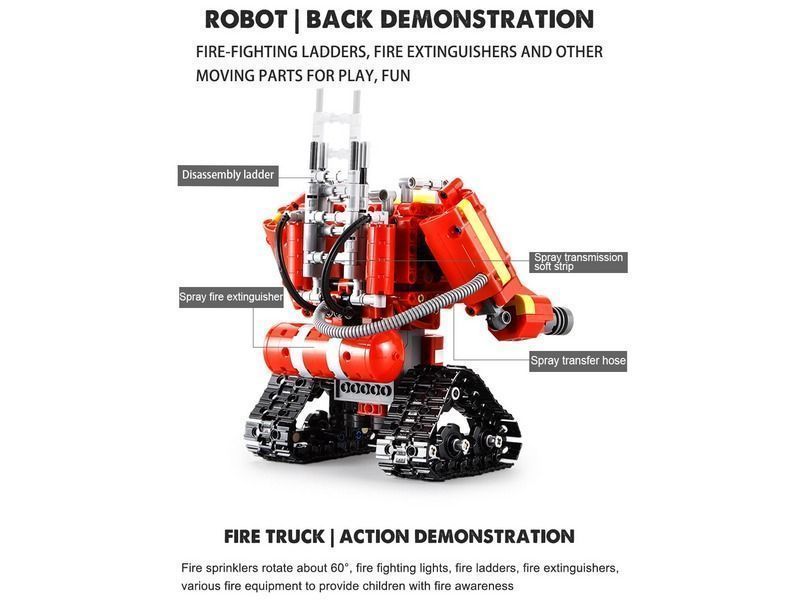 C51048W представляет собой набор 2 в 1 для постройки робота и пожарной машины на радиоуправлении и содержит 538 деталей! Робот-пожарный CaDa С51048W в собранном виде очень подвижный и маневренный, так же вращается голова и руки робота. Второй вариант сборки - пожарная машина. Помимо деталей корпуса и колес, в комплект входят 2 электродвигателя, приемник, аккумулятор 3.7В и все в одном блоке, и пульт! Детали в наборе отлично подогнаны друг к другу, поэтому сборка не вызовет трудностей, а собранная модель не развалится во время игры.