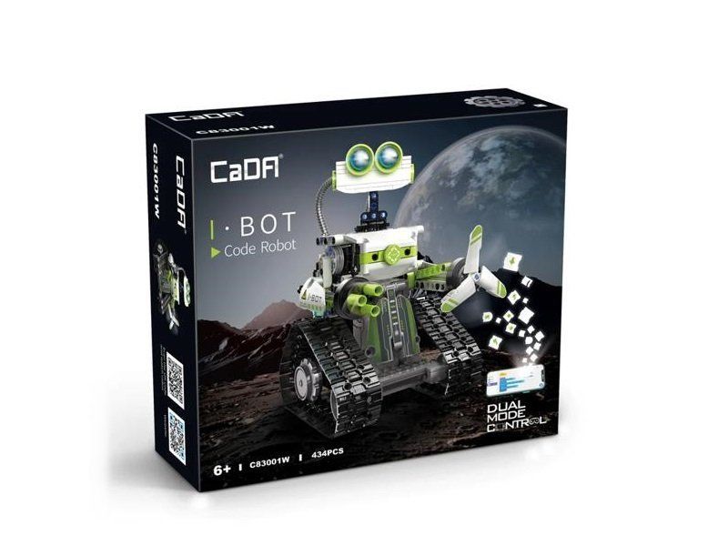 Радиоуправляемый конструктор от CADA представляет собой набор для сборки программируемого робота I.BOT из 434 деталей. Управлять моделью можно как при помощи пульта управления, так и приложения на телефоне, при этом можно выбрать один из нескольких вариантов управления. Голова робота поворачивается, оружие вращается, а глаза светятся.