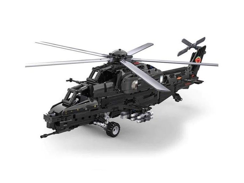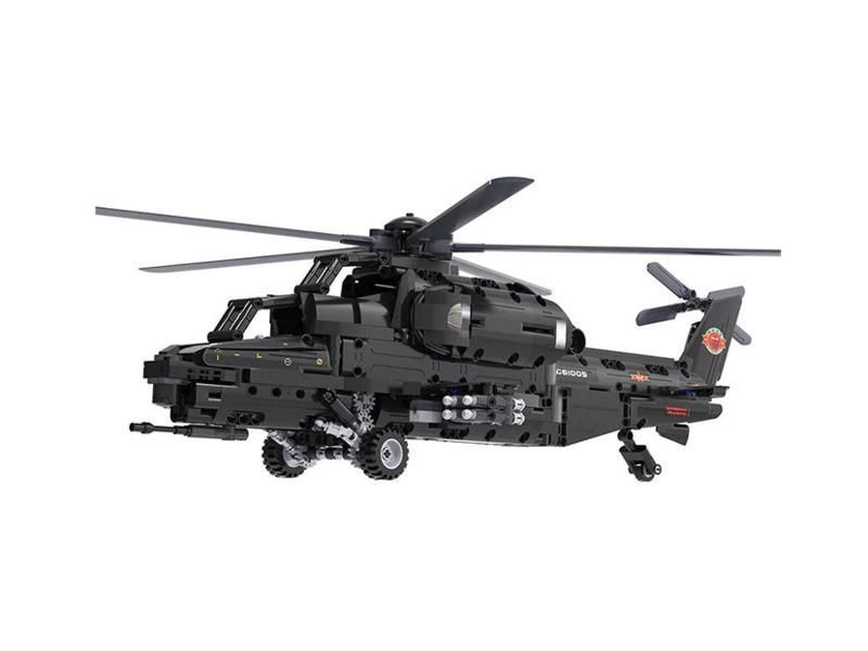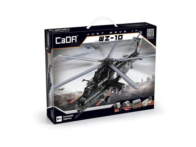 Радиоуправляемый конструктор от CADA представляет собой набор для постройки китайского ударного вертолёта WZ-10 из 989 деталей. Полностью функциональная модель сделана с вниманием к мельчайшим деталям - кабины пилота и наводчика можно открыть, заднее шасси убирается. На борту имеется внушительное вооружение из восьми ракет и двух пушек, из которых можно стрелять. Наклейки повторяются символы и надписи реального прототипа. Вертолёт летает вперёд и назад и поворачивается.