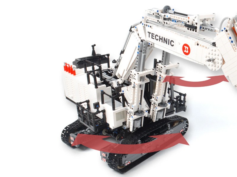 Экскаватор может вращаться на 360 градусов и оснащен широкими гусеницами для предотвращения скольжения во время движения. Экскаватор имеет гибкую механическую стрелу, которую можно свободно выдвигать с помощью зубчатой передачи. Все пакеты с деталями пронумерованы для легкой сборки.