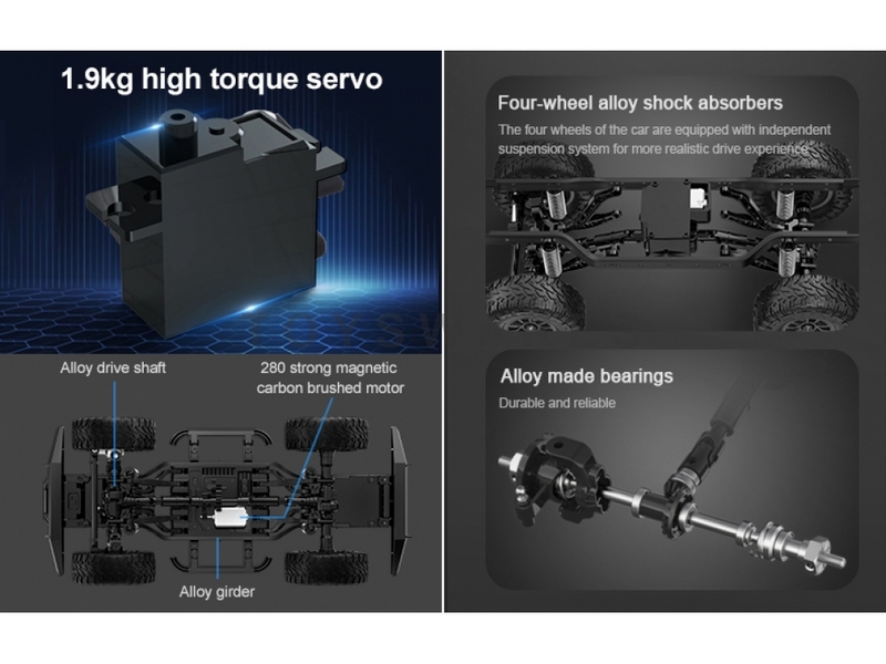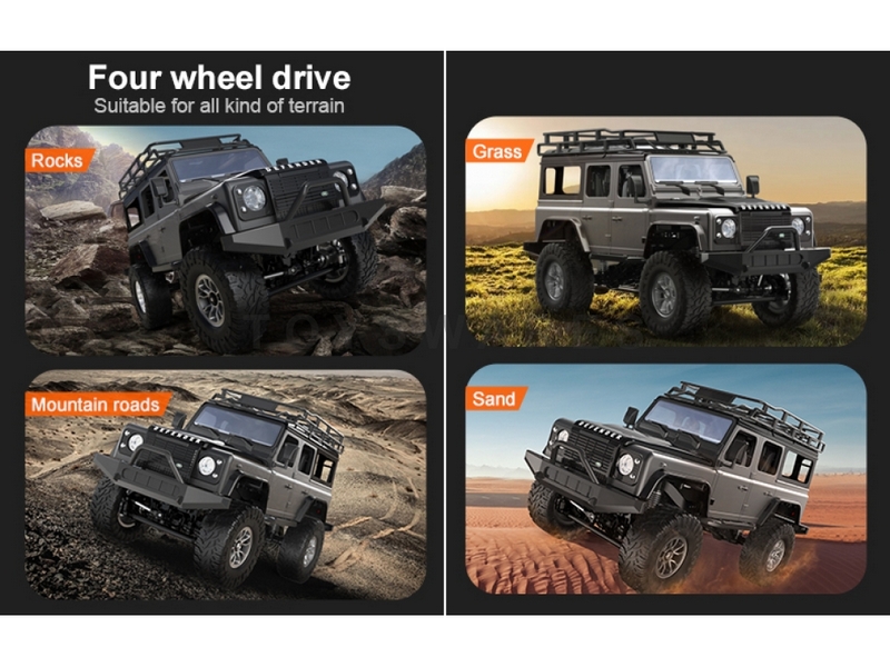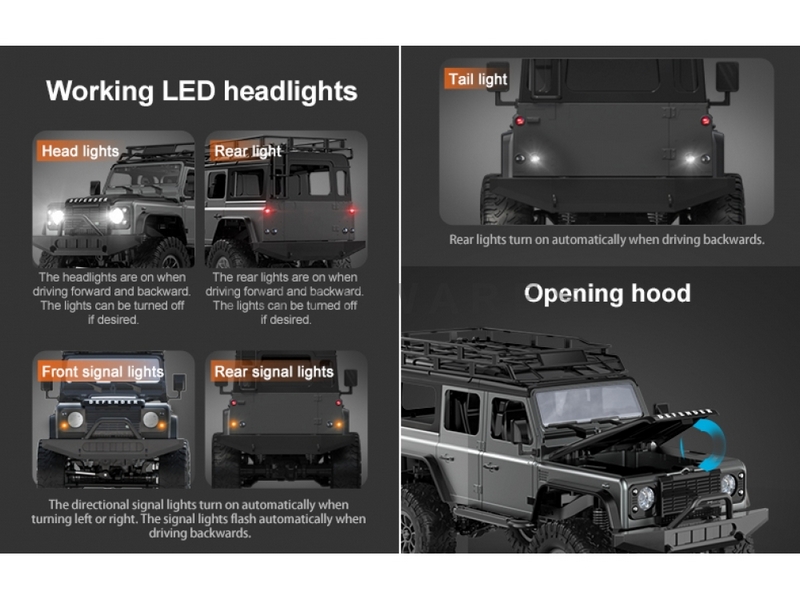 Land Rover может совершать движение в привычных направлениях вперед/назад, вправо/влево. Полный привод 4WD позволяет кататься в сложных дорожных условиях, таких как горы, песчаные земли, бездорожье, скалистый пляж. Независимая четырехколесная подвеска добавляет устойчивости на неровных поверхностях и во время подъема. Багажник на крыше дает возможность перевозить небольшие предметы и дополнительно защищает автомобиль. На Land Rover D110 установлен комплект освещения, что дает возможность кататься и в темное время.
