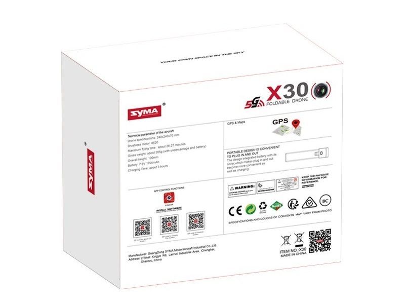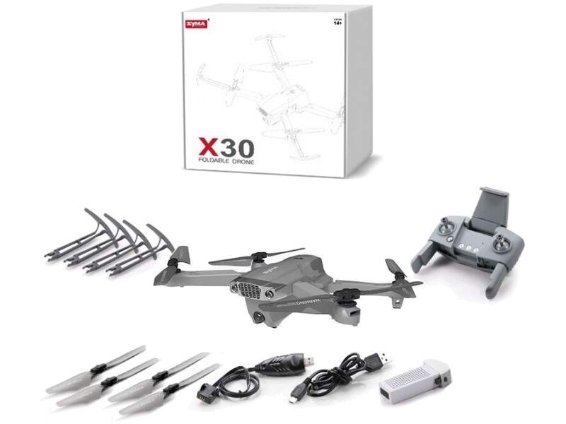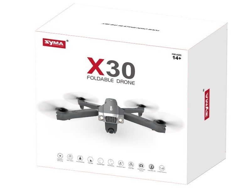 Новый компактный складной квадрокоптер Syma X30. Оснащен двумя камерами. Первая - основная с разрешением видео FullHD и вторая VGA, расположенная в нижней части дрона для снимков объектов под квадрокоптером. Камера оснащена сервомеханизмом для изменения положения.