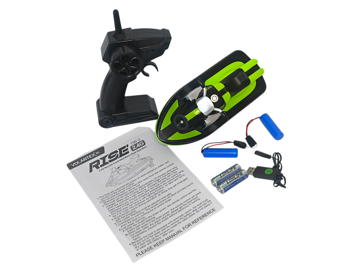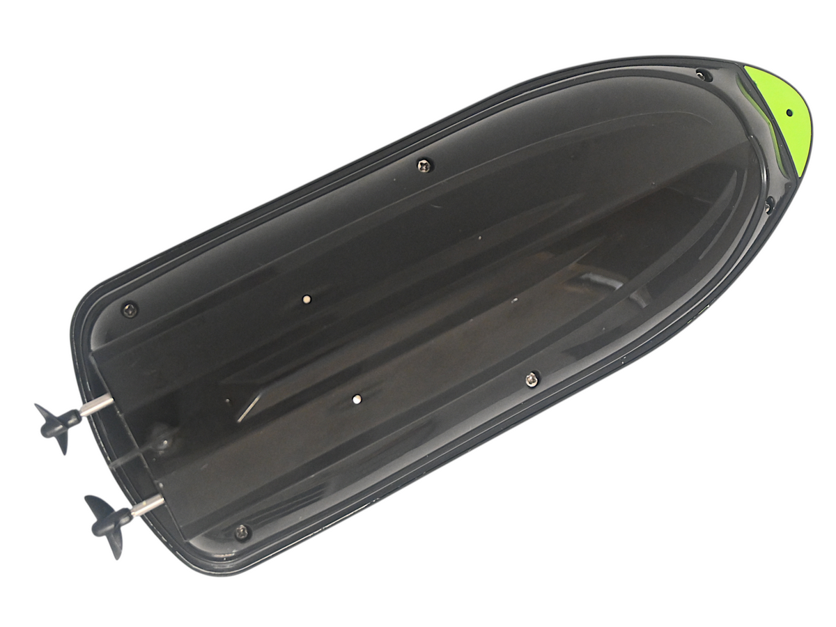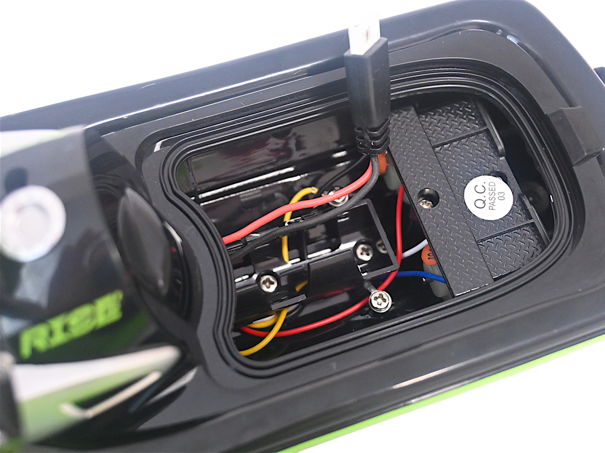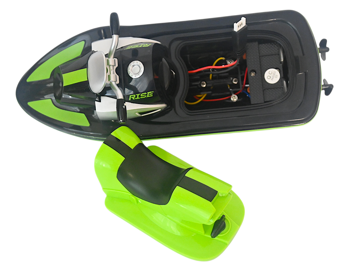 Конструкция корпуса обеспечивает защиту от опрокидывания. 2 аккумуляторные батареи 3,7v 650mAh и зарядное устройство USB обеспечивают катеру до 20 минут непрерывного движения.