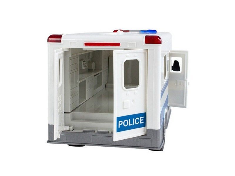 Отличный полицейский фургон с высокой детализацией деталей в масштабе 1:18. Все движения как у настоящей полицейской машины. Машинка имеет световые эффекты - мигалку сине-красного цвета и звуковую сигнализацию. Кроме того, боковая и задние двери фургона открываются, поэтому с собой можно взять команду. В комплекте смелый полицейский с оружием, готовый задержать преступника.