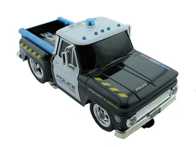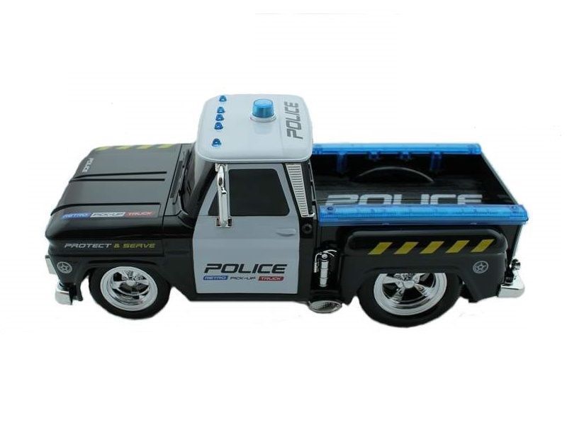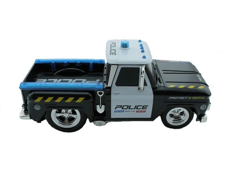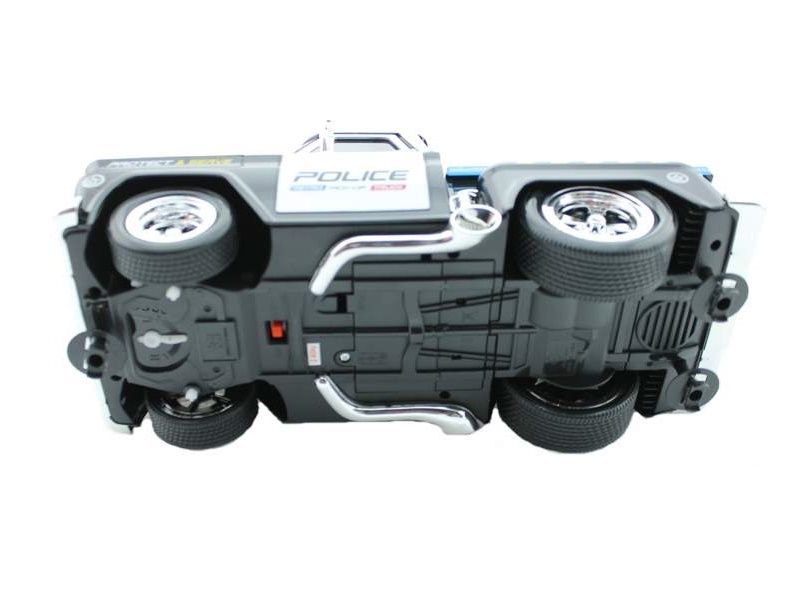 Автомобиль спереди оснащен огнями (свет фар). Два маленьких колеса спереди и два больших колеса сзади придает машине особый стиль. Машина имитирует четыре вида звука работающего двигателя и один звуковой сигнал. А на крыше кабины установлены проблесковые маячки полиции синего цвета.