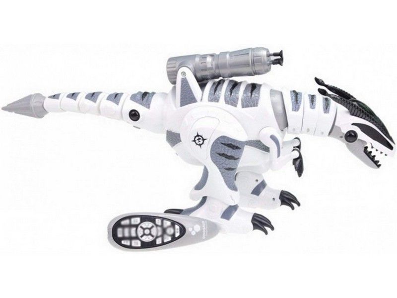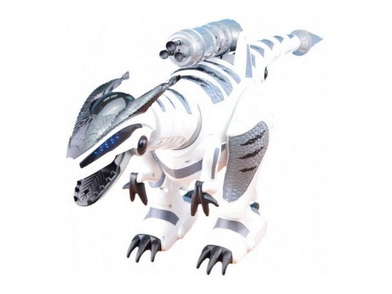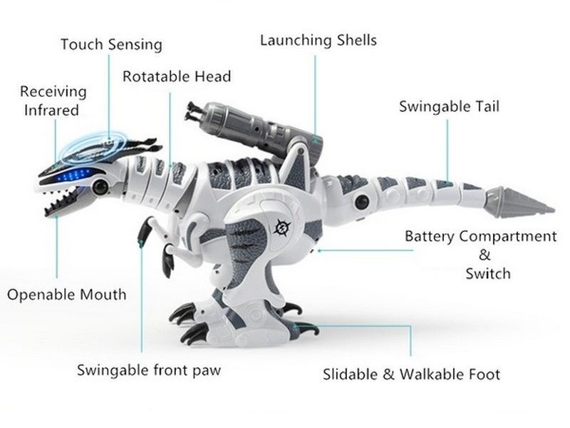 В голову динозавра встроены датчики, которыми он распознаёт предметы и ваши касания. Он умеет вращать головой, зажимать в челюстях легкие предметы и играть с ними. Динозавр поразит вас своими динамичными шагами и движениями под 3 различные музыкальные композиции. В случае опасности готов постоять за себя и умеет стрелять присосками.