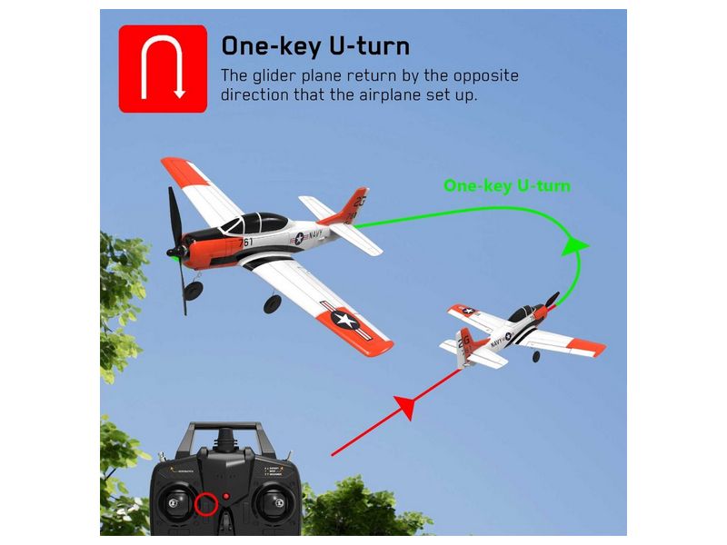 Функция разворота одним нажатием кнопки позволяет планеру вернуться в противоположном направлении от взлетающего самолета. Вы просто активируете функцию разворота до того, как самолет на радиоуправлении взлетит, и нажимаете кнопку «Разворот» во время полета, самолет автоматически улетит обратно с включенным гироскопом.