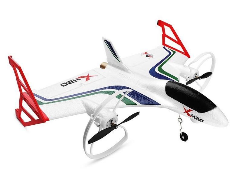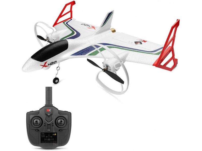Чрезвычайно легкий самолет X420 VTOL изготовлен из удароустойчивого материала EPP, оснащен мощными коллекторными моторами и способен вертикально взлетать и приземляться на небольших площадках. На взлете и посадке используется особый режим стабилизации, благодаря которому самолет ведет себя как квадрокоптер. После набора высоты можно активировать горизонтальный режим стабилизации и X420 будет летать как обычный самолет, удерживая текущую высоту и компенсируя крены, а если активировать 3D режим, X420 превратится в обычный пилотажный самолет, который легко выполняет петли, бочки и другие пилотажные фигуры.