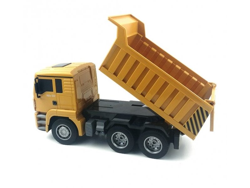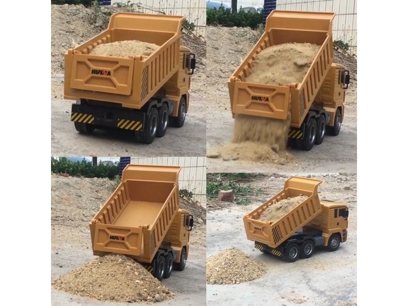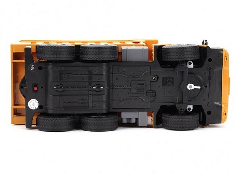 Управлять устройством можно при помощи пульта на частоте 2,4 ГГц, который работает от пальчиковых батареек. Передвижение вперед-назад происходит при зажатии обеих рычагов на пульте. Так же с пульта управляется поднятие кузова грузовика. Вы сможете загрузить кузов вручную или при помощи экскаватора, перевести на нужное место и выгрузить автоматически.