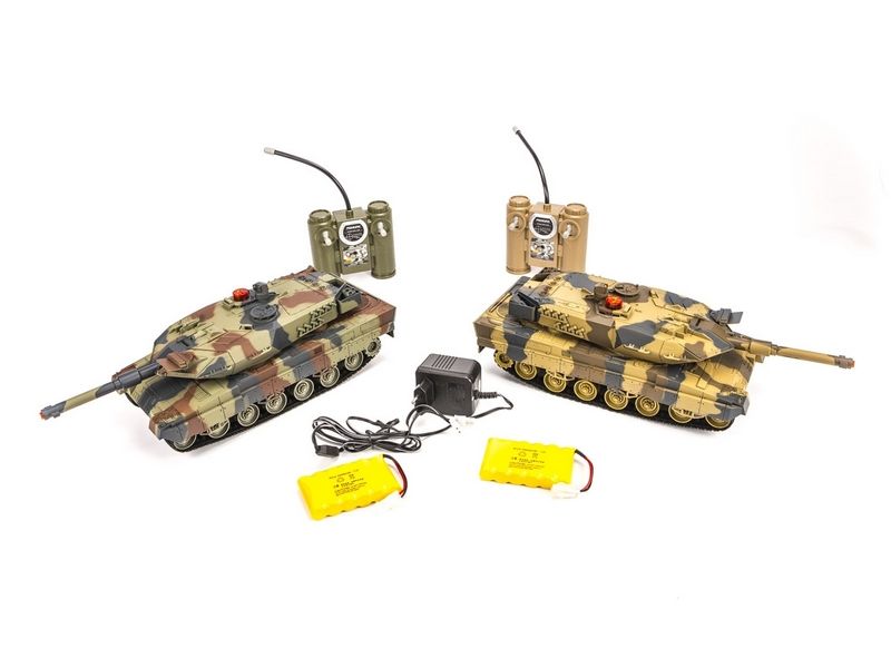Радиоуправляемый танковый бой Huan Qi Abrams vs Abrams 1:24 включает 2 танка на пультах управления. Каждый танк имеет инфракрасную пушку (луч, который наводится на танк соперника). При попадании на вражеском танке загорается светодиод. У каждого танка по 4 жизни (на них расположены 4 красных лампочки, которые с характерными звуками угасают при попадании в танк). После того, как последняя "жизнь" танка будет утеряна - он выключается с характерным звуком. Для продолжения игры его можно включить при помощи пульта управления. Инфракрасная пушка может бить на расстояние до 3 метров. Управлять танками можно с расстояния до 10 м. Игрушки оснащены реалистичными звуковыми эффектами: запуск и работа двигателя, выстрелы. Танк может двигаться вперед, назад, поворачивать вправо-влево и разворачиваться на месте. Башня танка вращается на 300 градусов, дуло поднимается и опускается вручную.