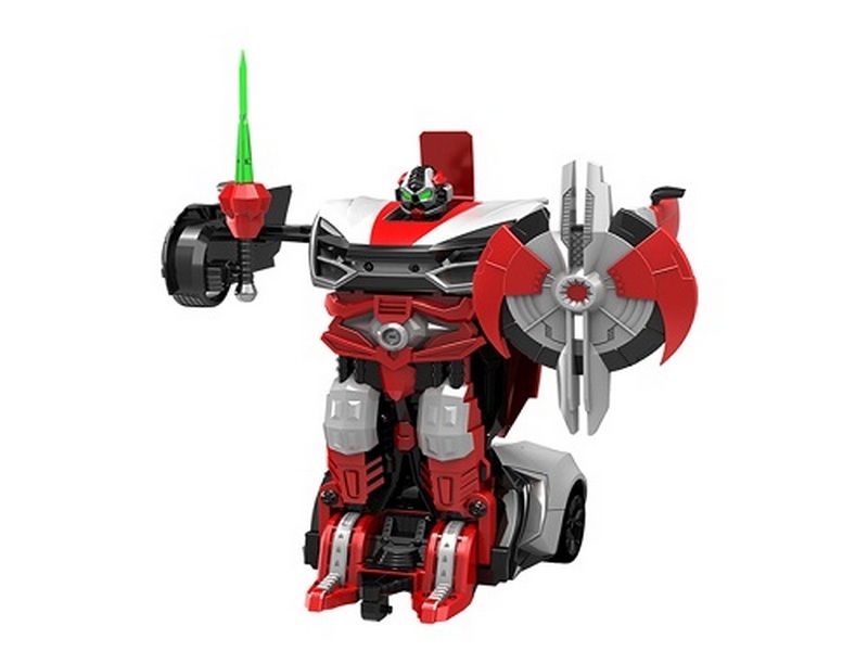 Робот изготовлен из прочного пластика и оснащен серьезным оружием - щитом и мечом для защиты мира от грозных пришельцев. В форме машинки с настоящими фарами робот может опередить любых противников на колесах, а при обретении формы робота – одержать победу над всеми врагами при помощи своего энергетического меча. Надежные колеса позволяют игрушке легко проходить крутые виражи с музыкальным оформлением. При попадании по корпусу включаются светодиоды. Игрушка настолько эффектна и функциональна, что заинтересует не только ребенка, но и взрослого человека.