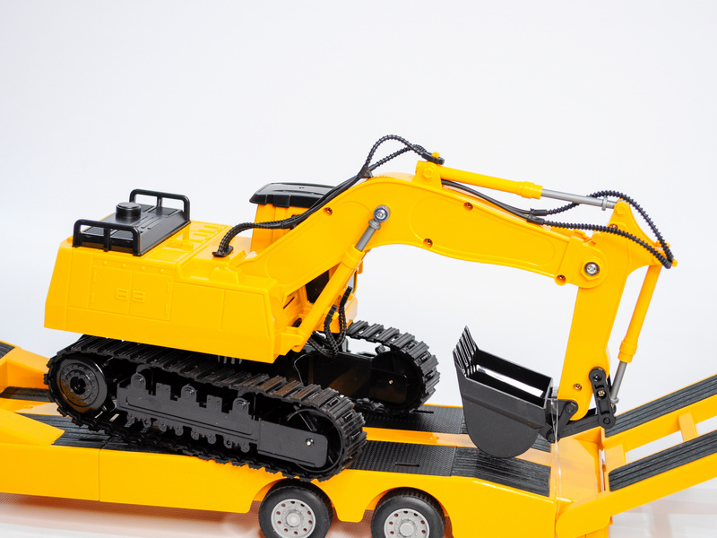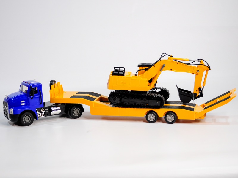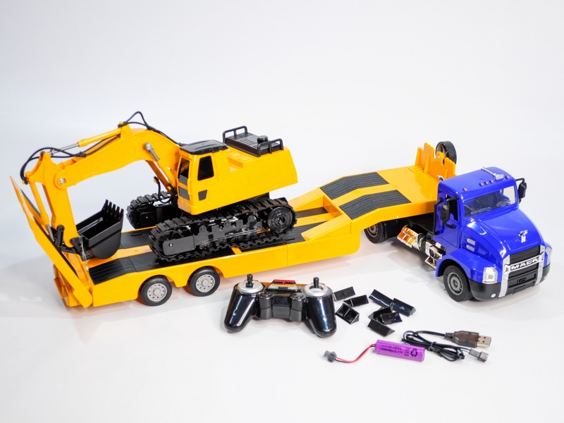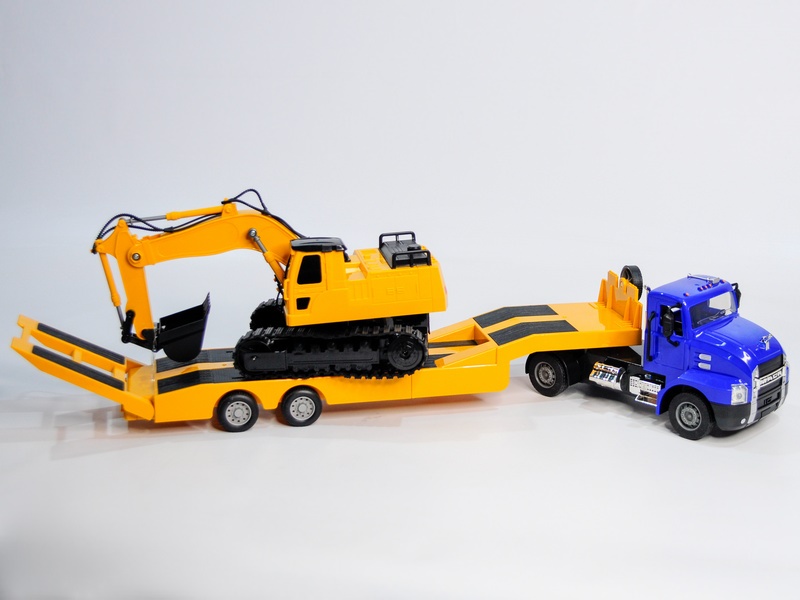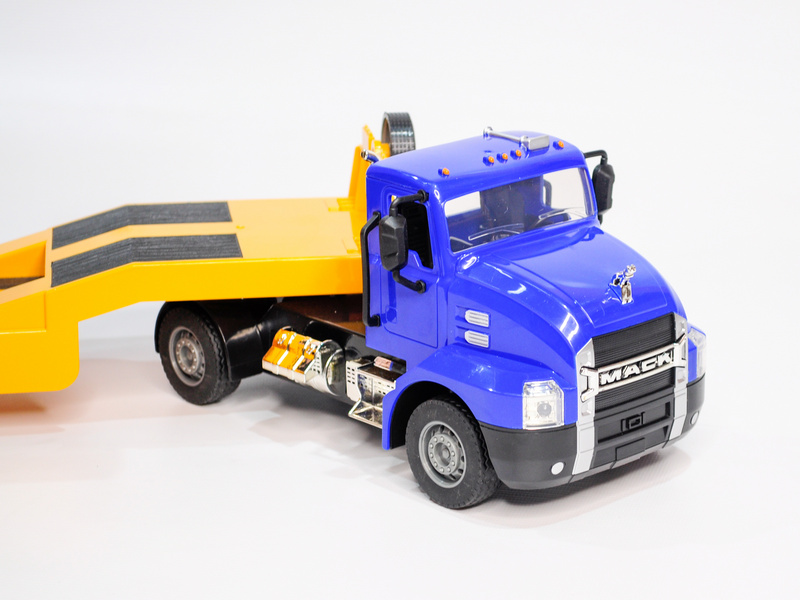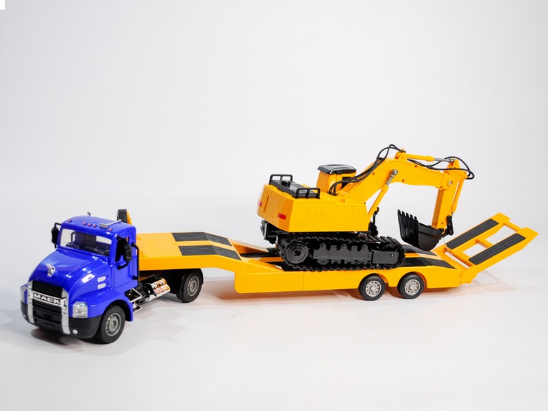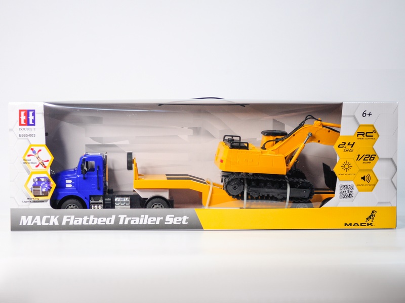 Радиоуправляемый тягач с тралом Double Eagle MACK в масштабе 1/26. Комбинация бортового прицепа и экскаватора с дистанционным управлением. Прицеп можно отцепить от тягача. Хвостовая пластина может быть опущена/убрана вручную. Манипулятор экскаватора с ковшом подвижный, кабина поворачивается. Частота 2,4 ГГц с защитой от помех позволяет играть с несколькими автомобилями.
