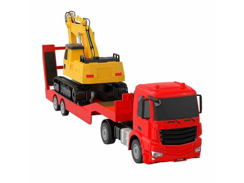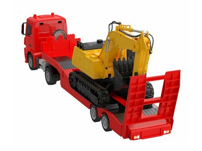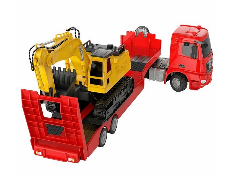 Радиоуправляемый тягач с тралом Double Eagle Mercedes-Benz Aroсs в масштабе 1/26. Комбинация бортового прицепа и экскаватора с дистанционным управлением. Прицеп можно отцепить от тягача. Хвостовая пластина может быть опущена/убрана вручную. Манипулятор экскаватора с ковшом подвижный, кабина поворачивается. Частота 2,4 ГГц с защитой от помех позволяет играть с несколькими автомобилями.