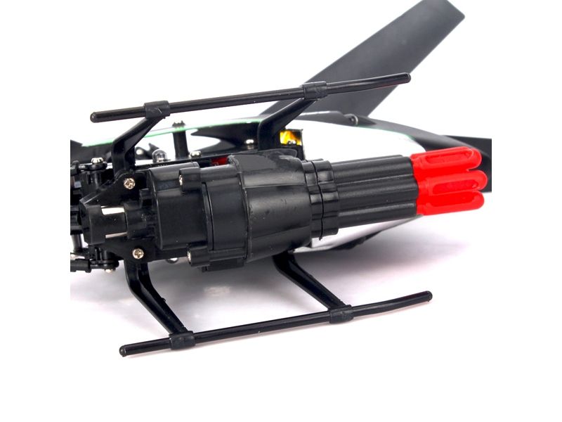 Соосная модель вертолёта Wltoys V398 RC shooter с действующей ракетной установкой со снарядами. V-398 имеет в своей конструкции пусковое устройство для шести ракет которым можно управлять с пульта, может стрелять одиночными выстрелами и очередями.