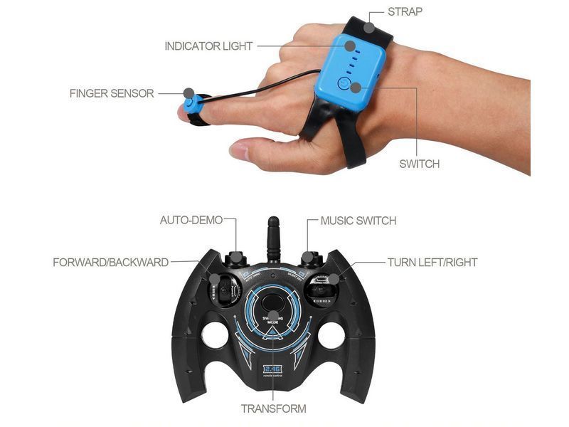 - Контроль жестами: в комплект входит дополнительный пульт, который фиксируются на ладони. Благодаря ему вы сможете управлять вездеходом лёгкими жестами одной руки. При этом вы сможете управлять не только направлением движения, но и изменять высоту подвески машины и делать трюки.