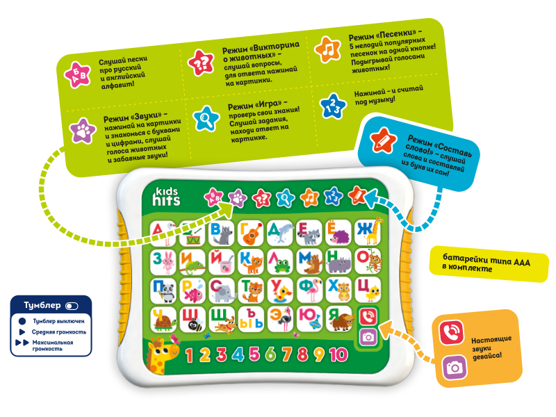 Хит Пэд предлагает различные режимы обучения, такие как викторина, игра, звуки и веселые песенки. С помощью функции "составь слово" дети смогут не только учить буквы, но и закреплять свои знания о различных словах, что способствует развитию их языковых навыков.