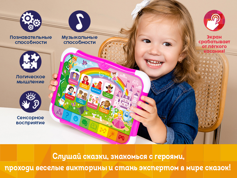 Развивающая игрушка Kids Hits Тач Пэд "В мире сказок" - это увлекательный и образовательный инструмент для маленьких исследователей в возрасте от 3 лет. Приготовьтесь погрузиться в волшебный мир сказок, где каждое прикосновение к сенсорному экрану переносит ваших детей в захватывающие приключения.