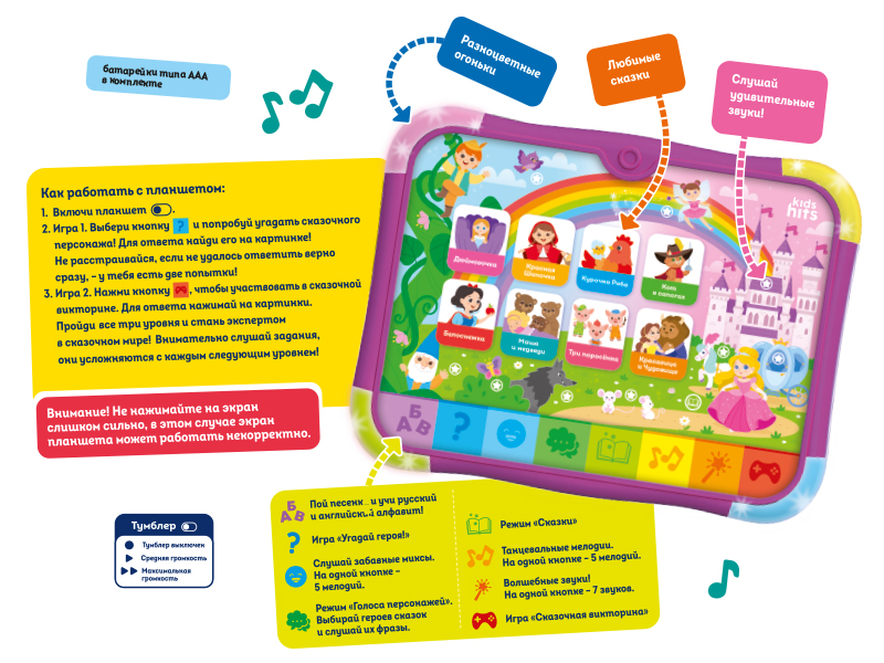 Слушая десять классических сказок, каждый юный слушатель познакомится с яркими героями, которые вдохновят на мечты и развлекут своим очарованием. Кроме того, 55 мелодий и звуков создает волшебную атмосферу, что делает занятия не только познавательными, но и увлекательными. Возрастные игры подарят возможность пройти веселые викторины, развивая логическое мышление и музыкальные способности.