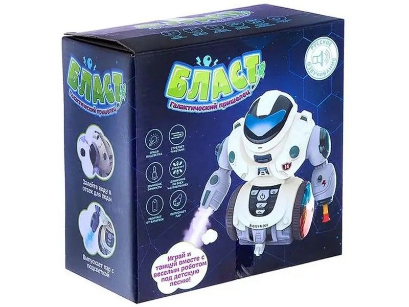 Робот Бласт Галактический пришелец - яркий функциональный робот на батарейках.Робот движется во всех направлениях, светится, танцует, издает звуки. Веселая музыка и песни сопровождают его п…