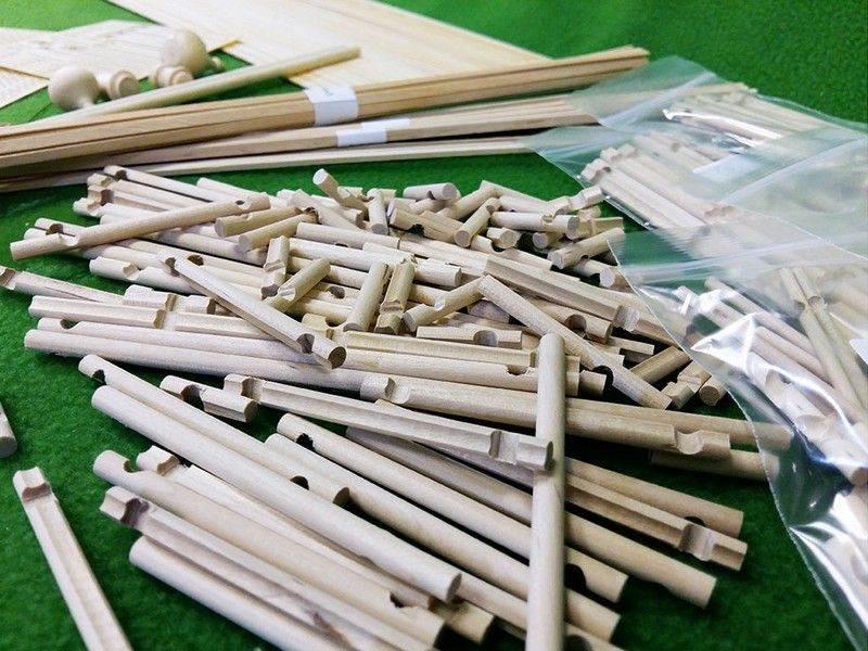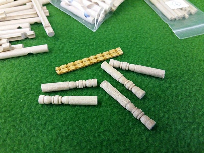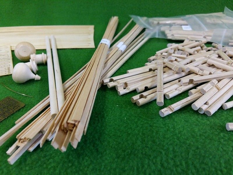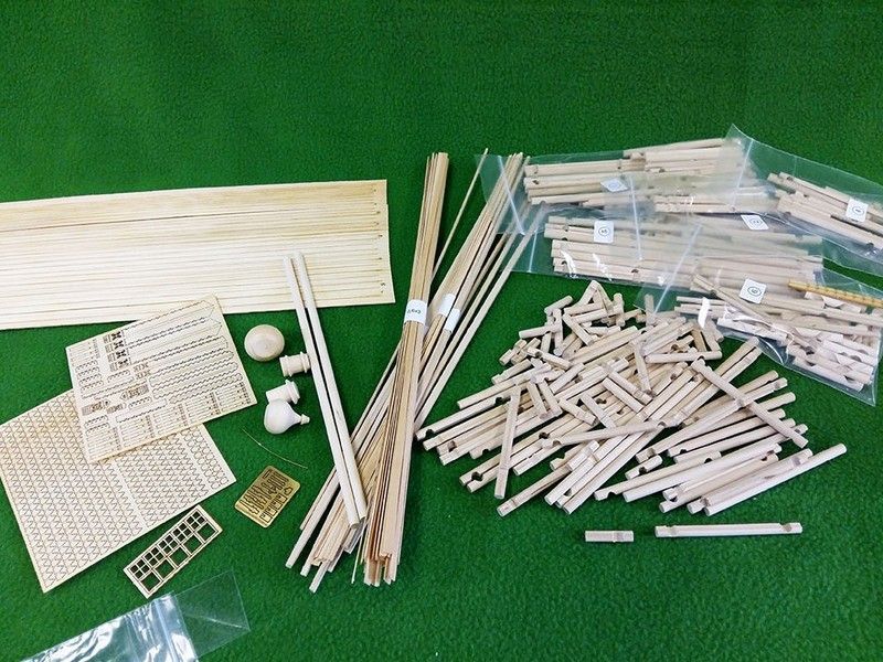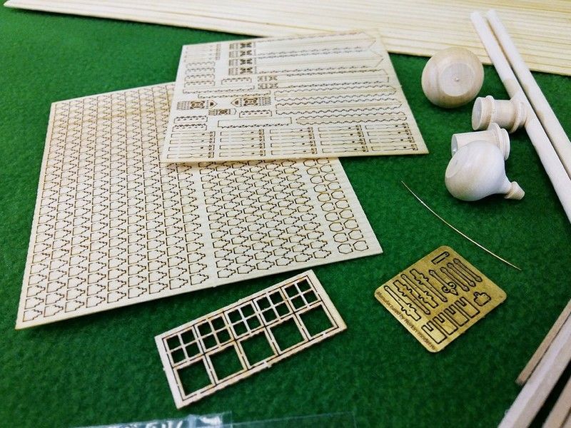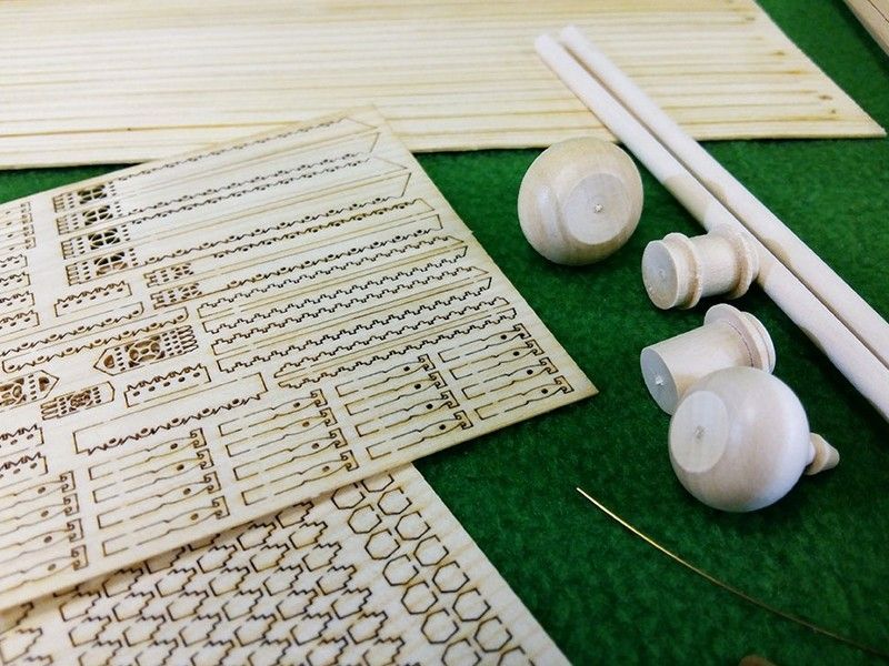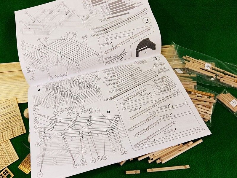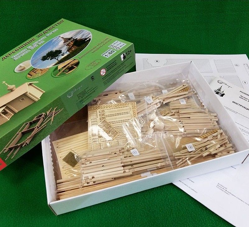 набор для для сборки: бревна с уже пропиленными пазами, детали фототравления для изготовления петель и дверных ручек, рейки для устройства крыш и полов, вырезанный лазером лемех, точеные детали маковок