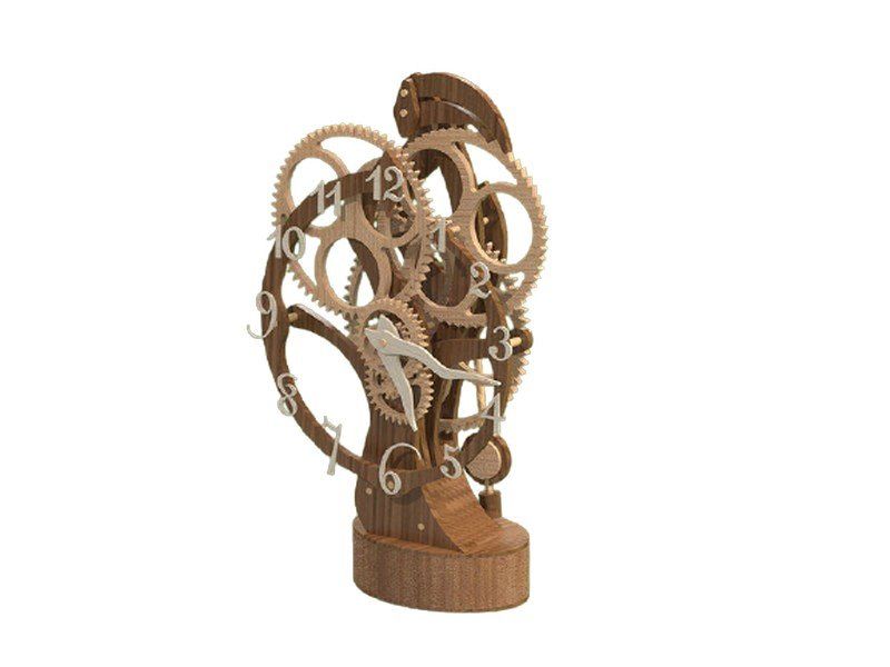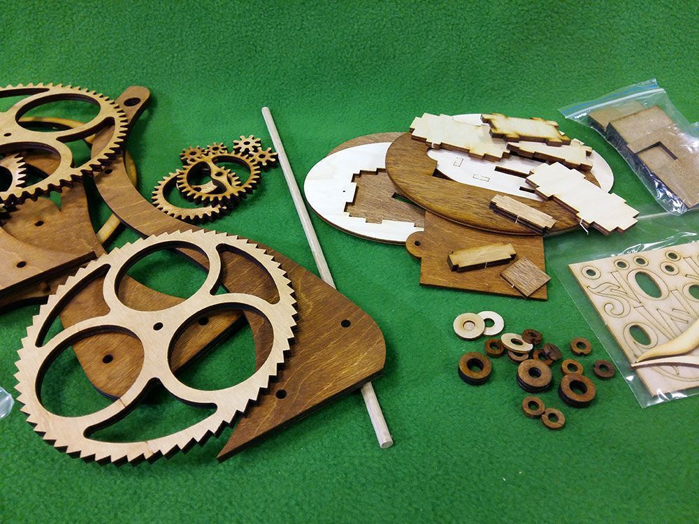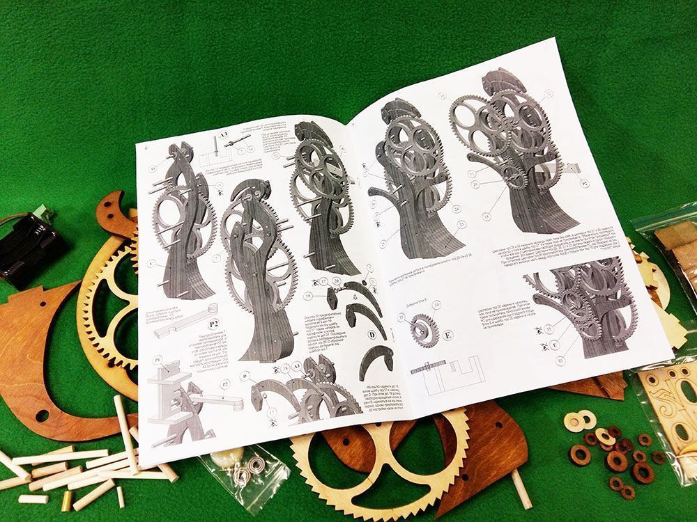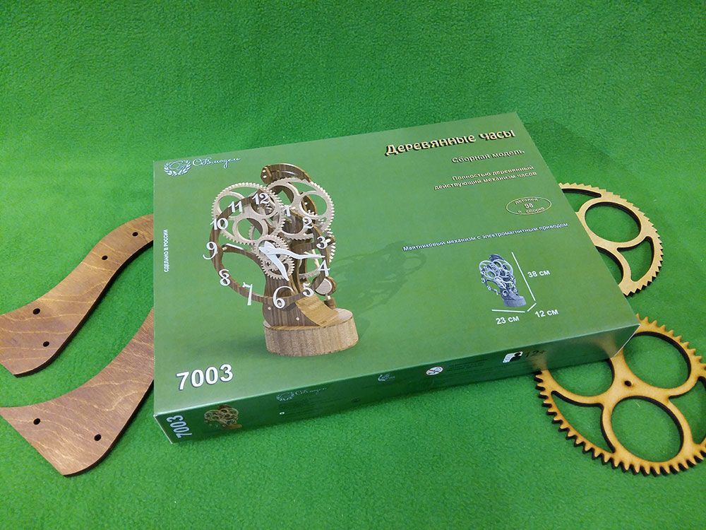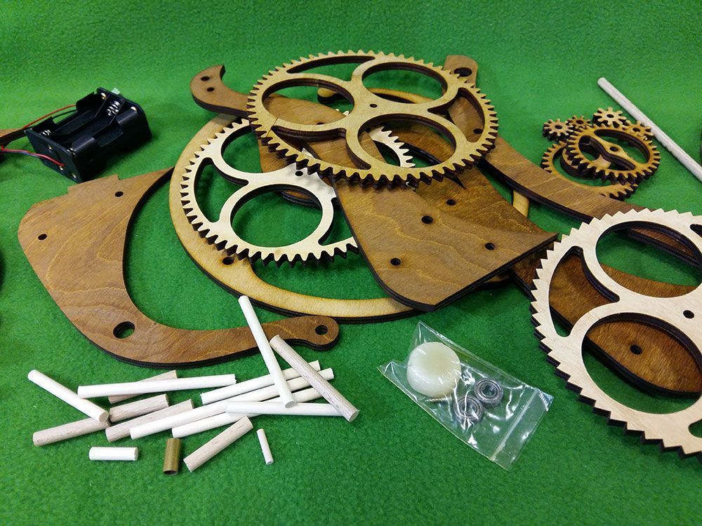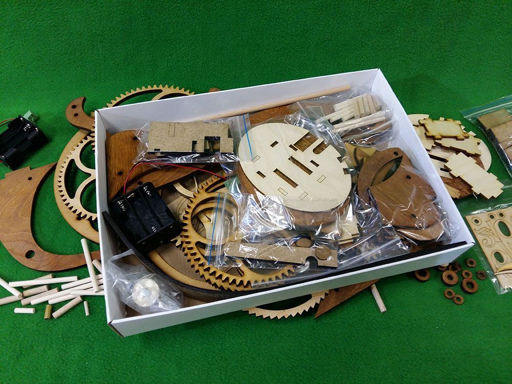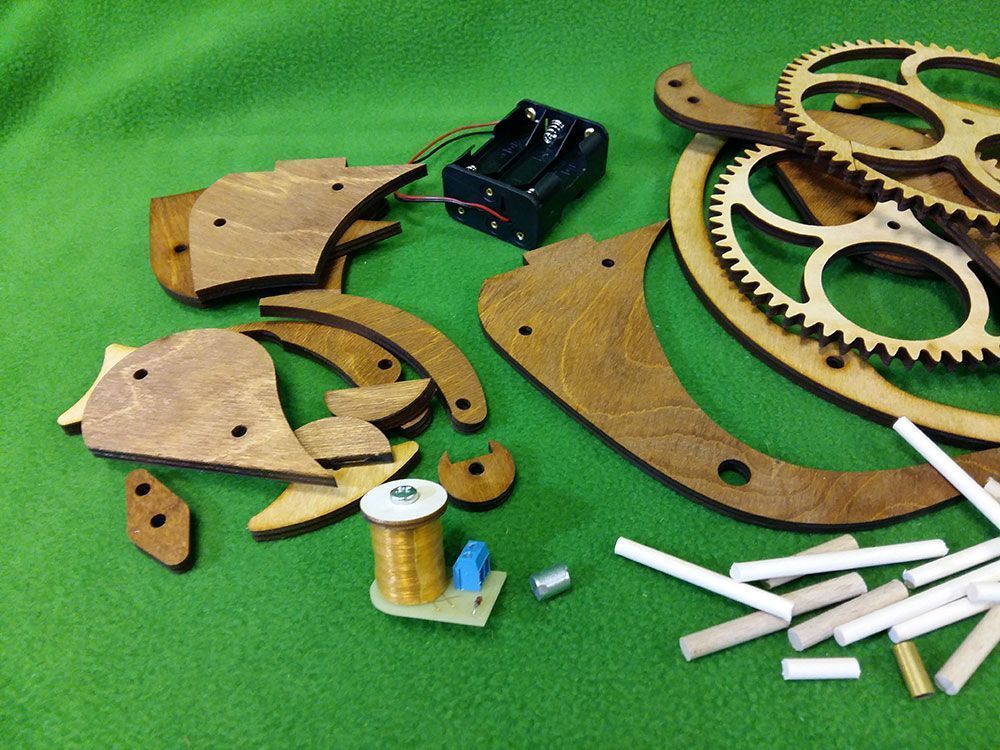 Набор для сборки деревянной модели Настольные / каминные часы. Интересны эти часы необычным спусковым механизмом, который при работе напоминает движения клюва птицы тукан. В часах применен электромагнитный привод маятника. Его принцип действия основан на отталкивании постоянного магнита, закрепленного на конце маятника, электромагнитной катушкой в момент прохода маятника над катушкой. Питание осуществляется от 6 элементов АА, размещенных в основании часов. При этом, никакого "электронного" управления, как скажем, в кварцевых часах, здесь нет - даже точность хода часов настраивается механически - перемещением линзы (грузила) маятника. Все детали часов выполнены лазерной резкой из предварительно мореной фанеры.