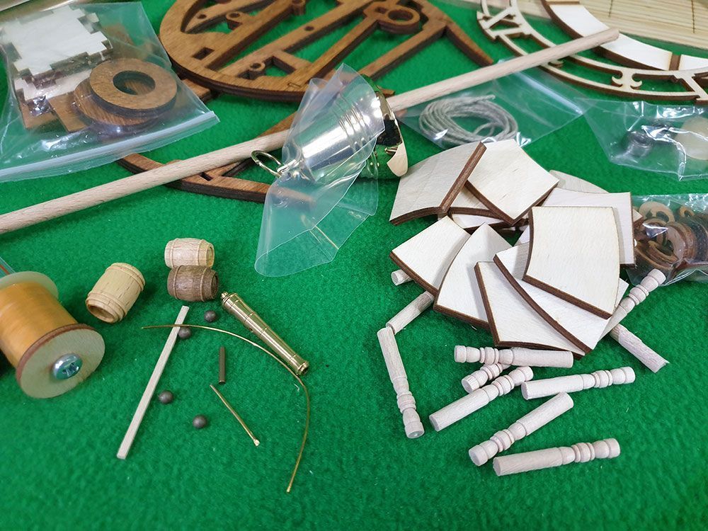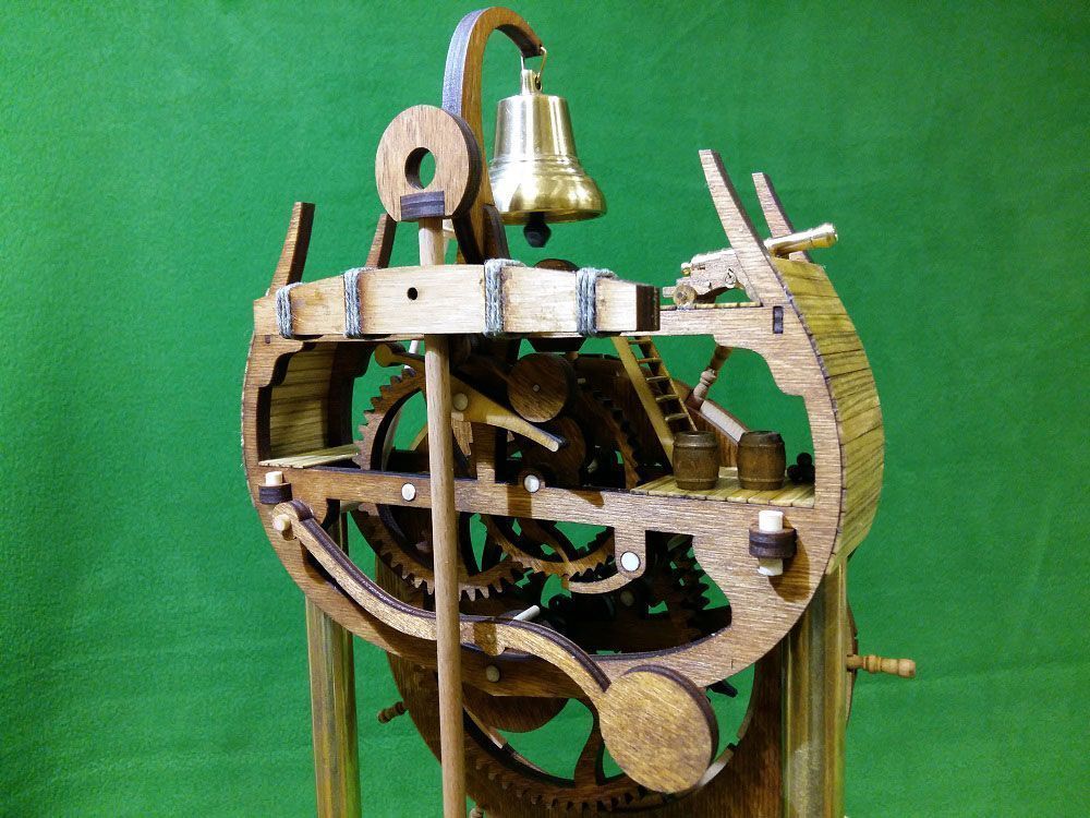 Набор для сборки деревянной модели Каминные морские часы. В конструкции данных часов совмещены часовой механизм и корабельную тему: корпус часов стилизован под разрез парусного фрегата, добавлен непременный для такого случая антураж - пушка, рында, бочки и т.д. Рында, кстати, действующая - часы отбивают "склянки" каждый час. Привод маятника - электромагнитный, точность хода подстраивается перемещением "якоря" на стреле маятника. Ось маятника посажена на подшипники для устранения люфтов и обеспечения легкости хода. Деревянные детали в данной модели, в том числе все шестерни, очень удачно гармонируют с латунными: из латуни в часах изготовлены стойки, колокол, пушка, а также втулка часовой стрелки. Все эти детали идут в наборе уже в готовом виде.