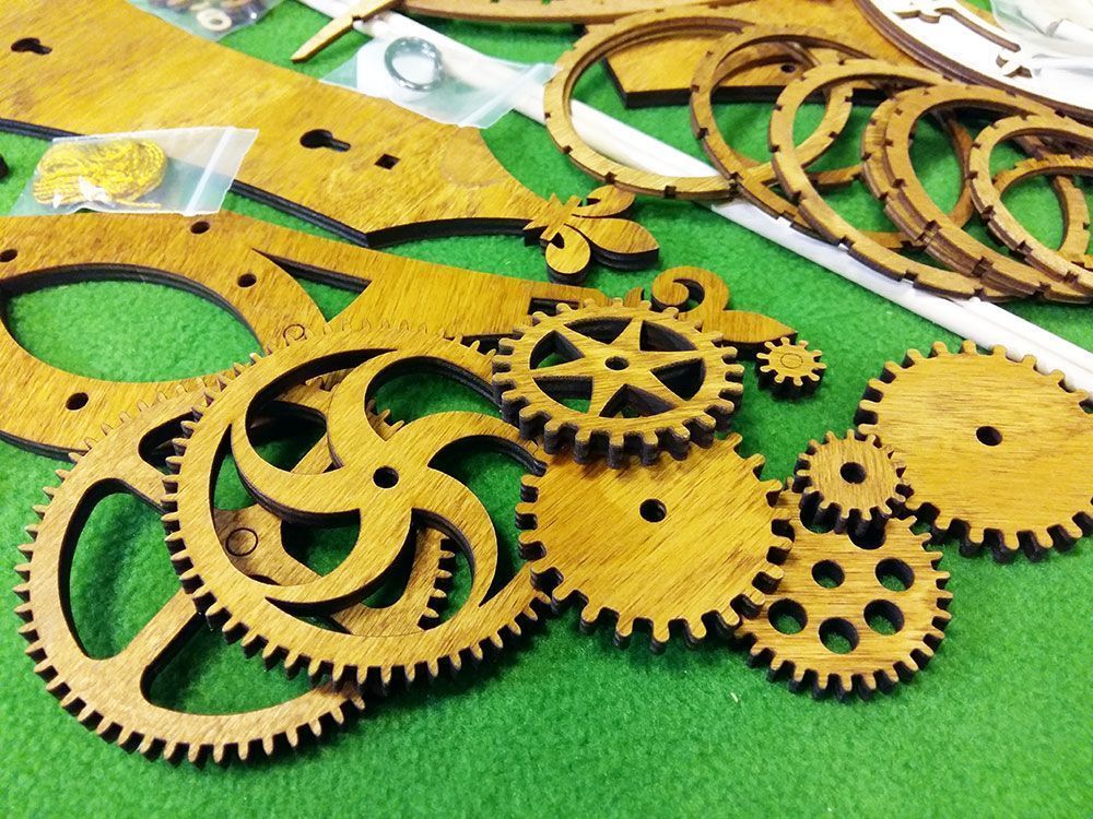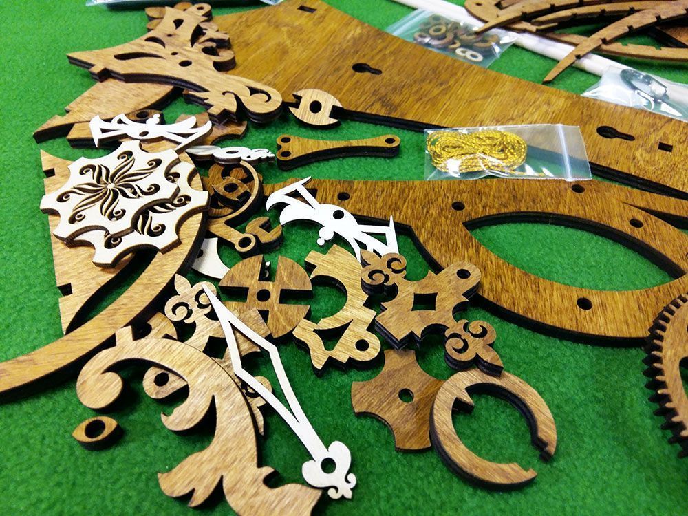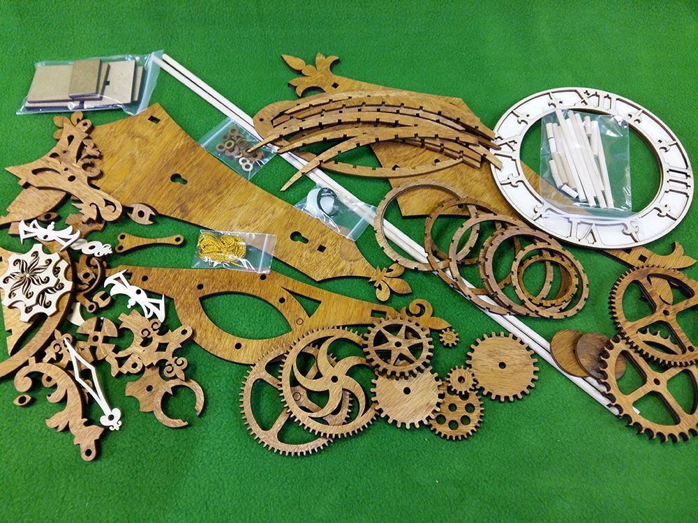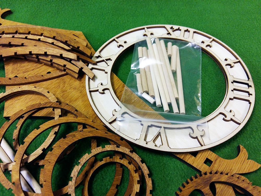 Набор содержит все необходимые детали для сборки часов. Шестеренки, вырезанные лазером из фанеры толщиной 6 мм, корпусные детали, деревянные оси, заводной шнур и т.п. При этом основная часть деревянных деталей уже тонирована морилкой под "орех", а такие детали, как циферблат - оставлены светлыми, их цвет Вы можете выбрать сами при сборке.