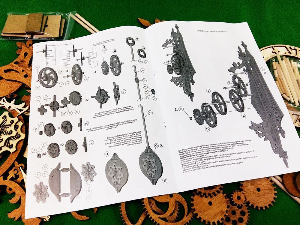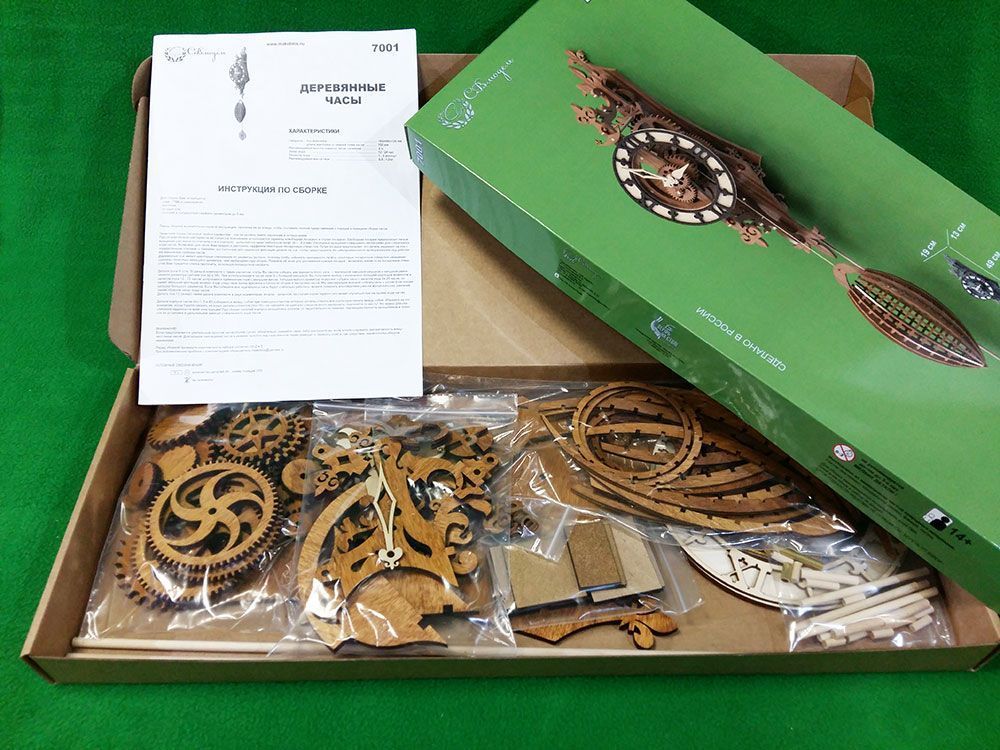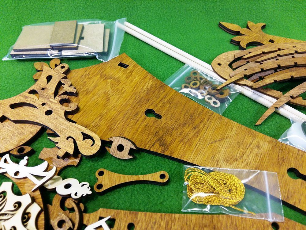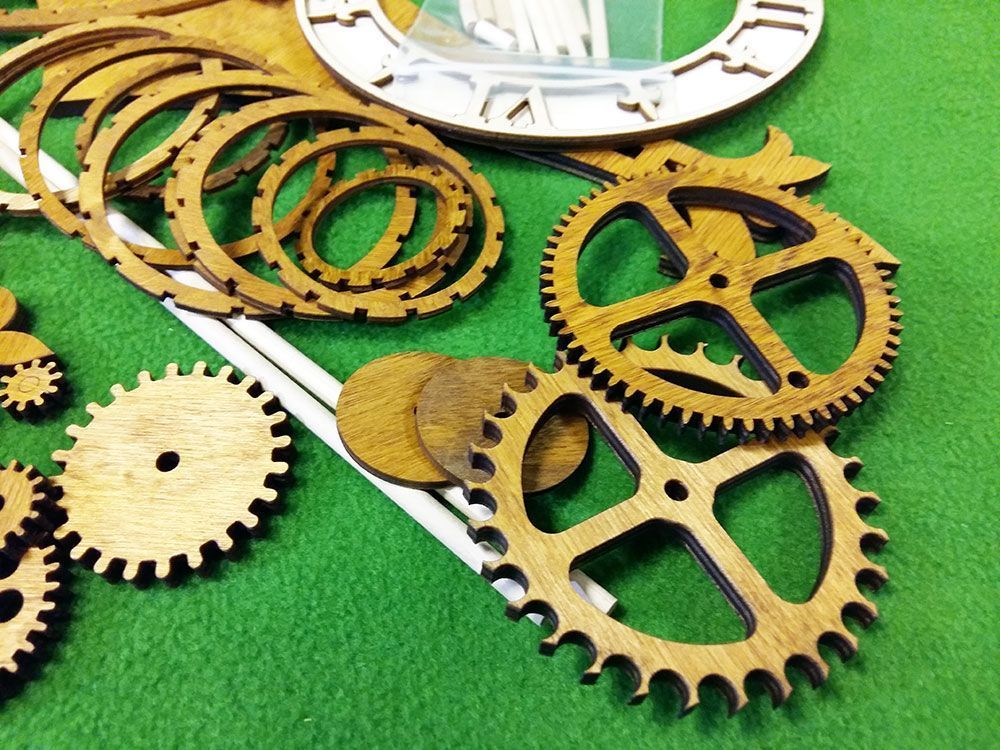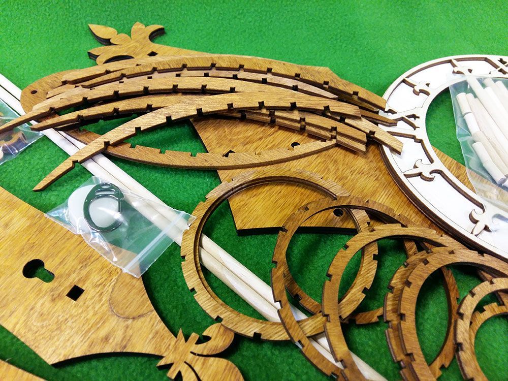 Набор содержит все необходимые детали для сборки часов. Шестеренки, вырезанные лазером из фанеры толщиной 6 мм, корпусные детали, деревянные оси, заводной шнур и т.п. При этом основная часть деревянных деталей уже тонирована морилкой под "орех", а такие детали, как циферблат - оставлены светлыми, их цвет Вы можете выбрать сами при сборке.