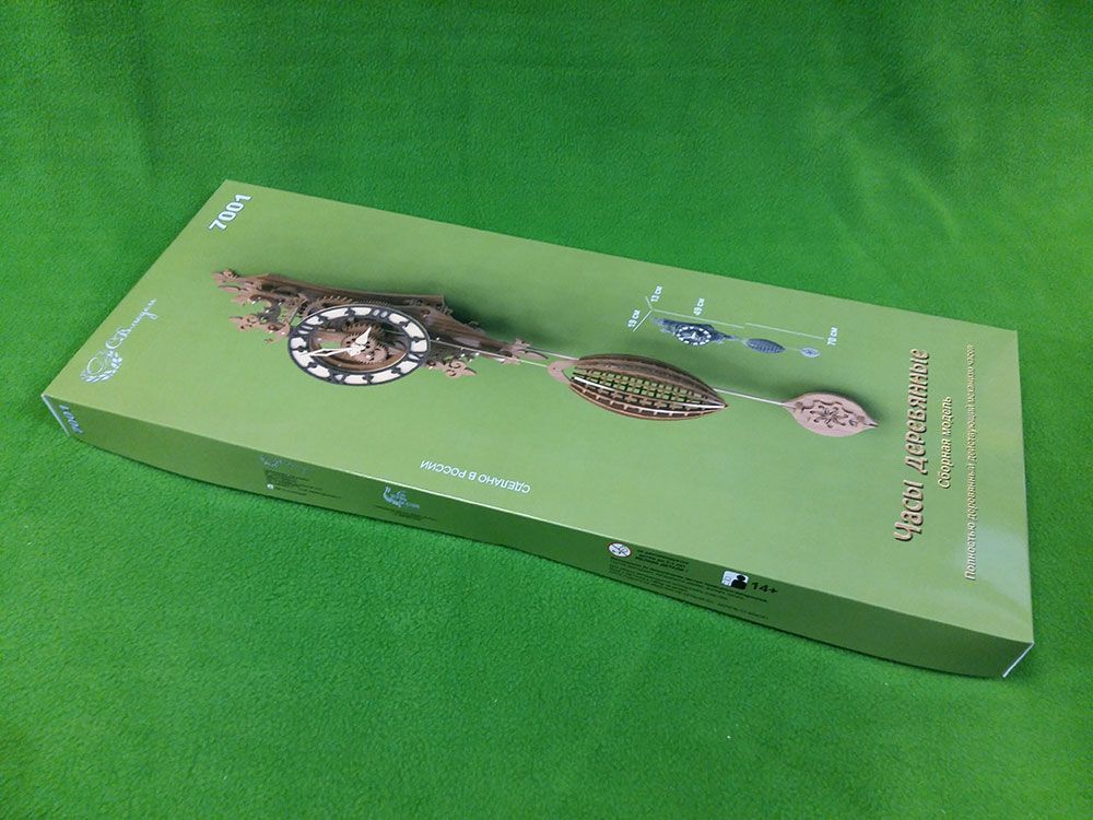 Настенные часы с гиревым приводом и спуском Грахама. Все детали часов, в том числе шестерни - деревянные. Конструкция часов сборно/разборная, часть деталей собирается без клея, на шплинтах, что позволяет производить настройку, ремонт и замену деталей, а при желании и усовершенствования, в том числе внешнего вида. Точность хода хорошо отрегулированных часов не хуже 2 минут в сутки. Часы приводятся в действие гирей. Она также выполнена из дерева, имеет ажурную конструкцию и позволяет засыпать или заложить внутрь любой подходящий груз. Мы рекомендуем использовать для этой цели камушки. Груз для гири в набор не входит! Для гарантированного хода часов необходим вес гири около 1 кг, однако при достаточно тщательной регулировке и сборке часы смогут работать и при уменьшении массы гири до 400...500 г. Запас хода часов 1 или 2 суток. Это зависит от того, какой диаметр приводной катушки вы будете использовать - в наборе предлагается два варианта. Катушка меньшего диаметра позволяет увеличить запас хода, но требует более тщательной сборки из-за уменьшения силового момента гири. Кроме того, запас хода зависит также от высоты подвеса часов, так как часы будут работать, пока гиря не коснется пола.