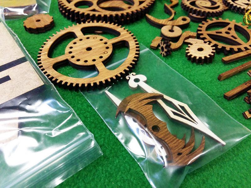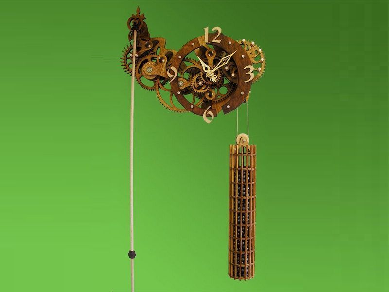 Все детали часов - деревянные. В этих деревянных часах применена тяжелая гиря массой 3 кг, которая подвешена через блок для увеличения свободной длины хода, а также большое передаточное отношение шестерен главного привода. Все это позволило увеличить запас хода до 4-х суток. Точность хода, как и во всех наших деревянных часах, при должной настройке - не хуже 2 минут в сутки.